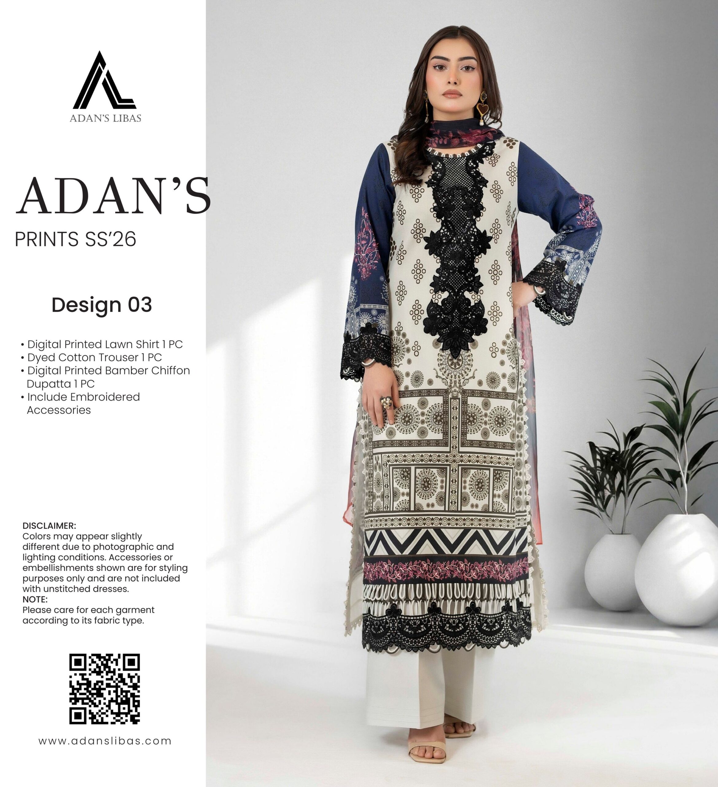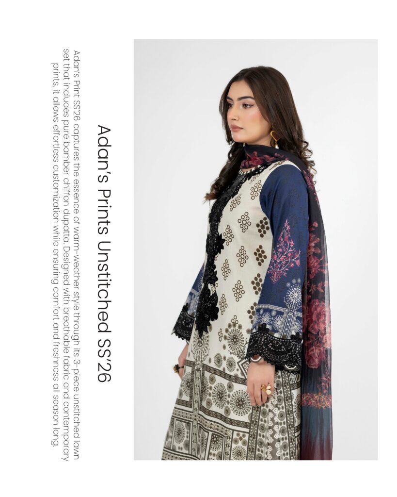 ADANS PRINTS DESIGN 3 Design DetailsDigital Printed Lawn ShirtDyed Cotton TrouserDigital Printed Bamber Chiffon DupattaExtra Embroidered PatchesPrice 2,400 Buy Now