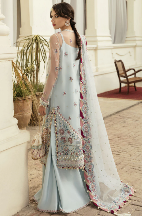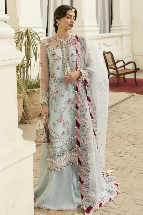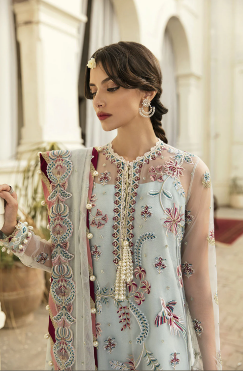 | Fabric: Net Embroidered front (1 Meters) Net Embroidered back (1 Meters) Net Embroidered sleeve (0.66 Meters) Organza Embroidered front + back border (A) (2 Meters) Organza Embroidered trouser border (2 Yards) Raw Silk Embroidered front + back border (B) (2 Meters) Raw Silk Embroidered sleeve border (1 Meters) Check Khadi Net Embroidered dupatta (3 Yards) Organza Embroidered dupatta border pallu (2.5 Yards) Raw Silk Trouser (2.5 Yards) |
