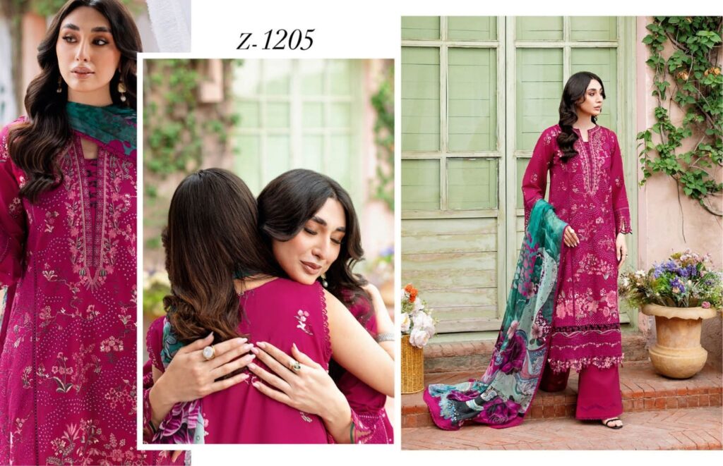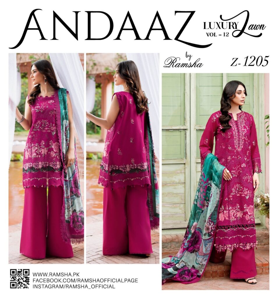 andaaz z1205 PRICE 3,500 Unstitched Dress Material Lawn Embroidered FrontLawn Embroidered BackLawn Embroidered SleevesOrganza Embroidered Border for SleevesOrganza Embroidered Border (Front & Back)Chiffon Digital Printed DupattaPlain Dyed Trouser Buy Now