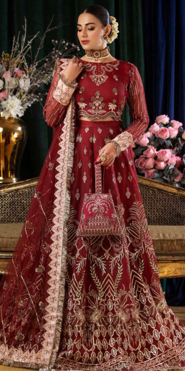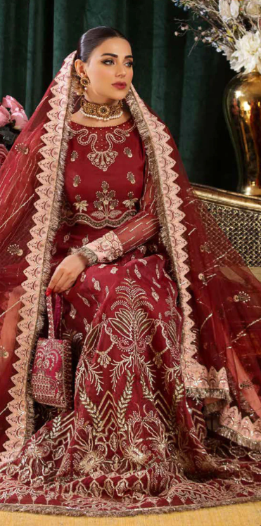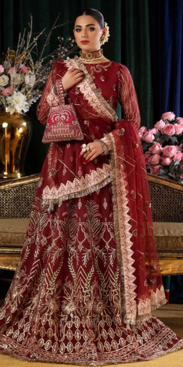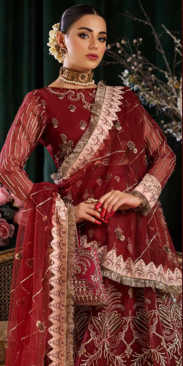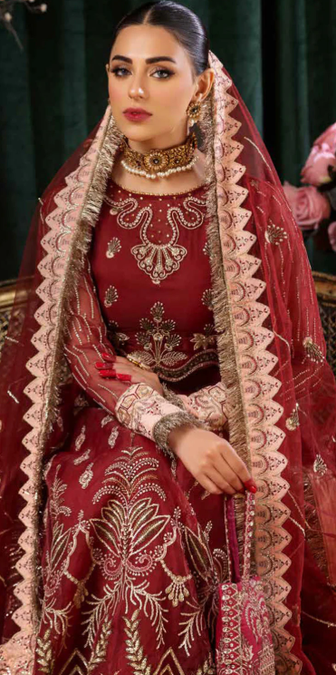| Fabric: Description: Unstitched luxury formals (wedding edition) chiffon collection vol-01 2024. 4 piece including lining 6 piece set Quality Fabric • Embroidered Organza Front Panels • Plain Dyed Organza Back Panels • Embroidered Organza Neck Patch • Embroidered Organza Front Body • Plain Dyed Organza Back Body • Embroidered Organza Sleeves • Embroidered Silk Sleeves Border • Embroidered Organza Dupatta • Embroidered Silk Daman Front & Back Borders • Embroidered Silk 4 Sides Dupatta Borders • Plain Dyed Raw Silk • Plain Dyed Inner |