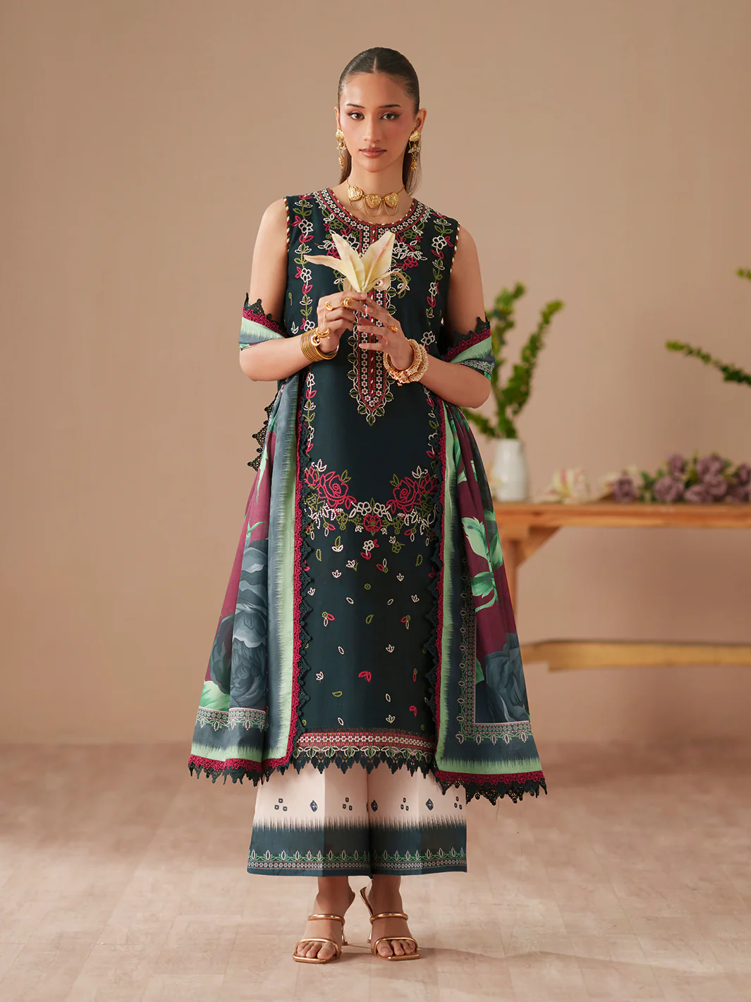 - Digital Printed Embroidered Front Shirt1 PieceDigital Printed Back & Sleeve1.58 MeterEmbroidered Sleeves Lace on Dyed Organza1 MeterDigital Printed Pure Silk Duppata2.50 MeterDyed Printed Cotton Trouser2.50 Meter