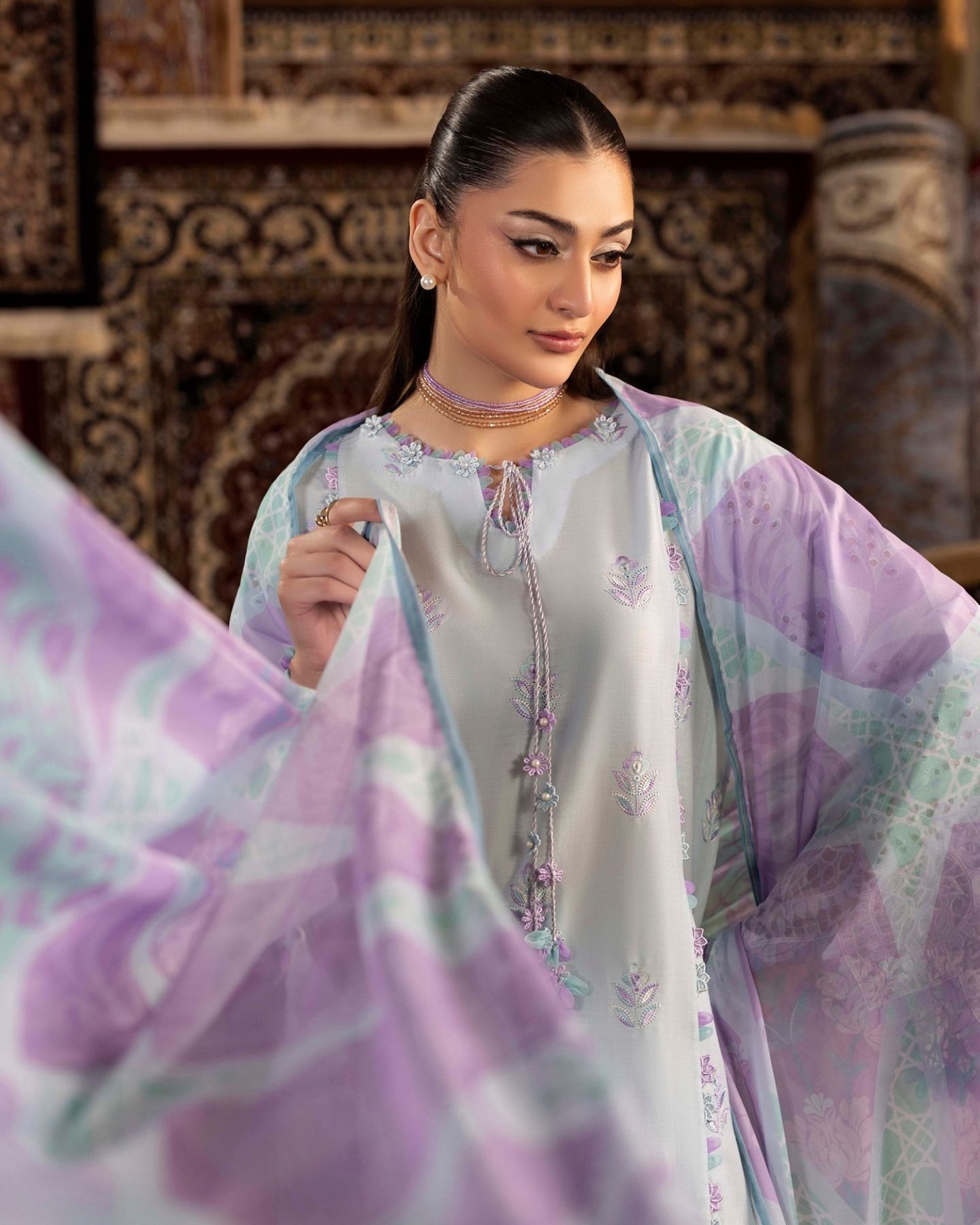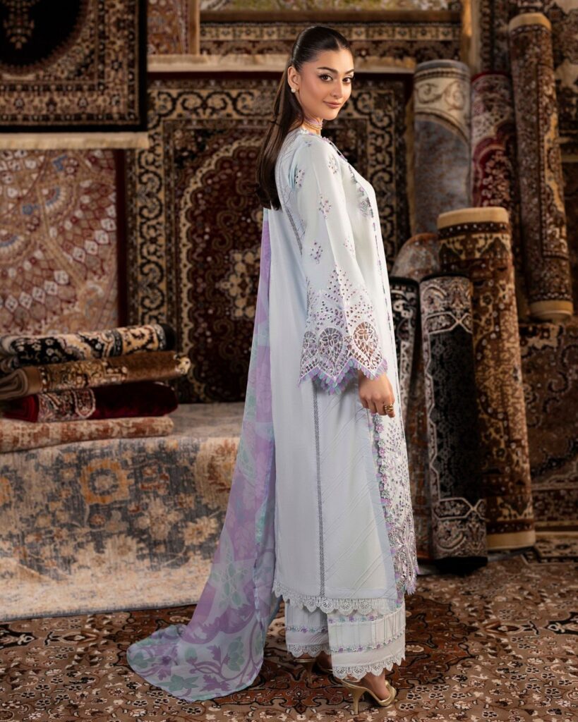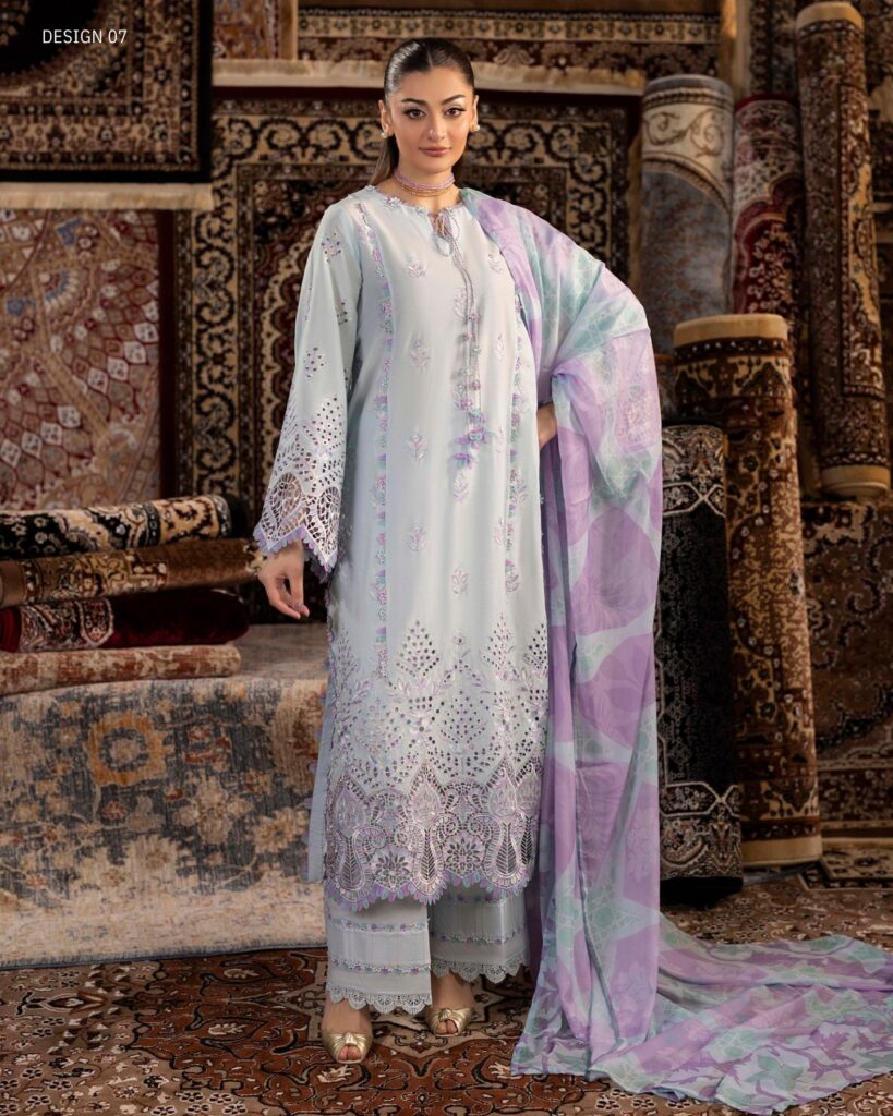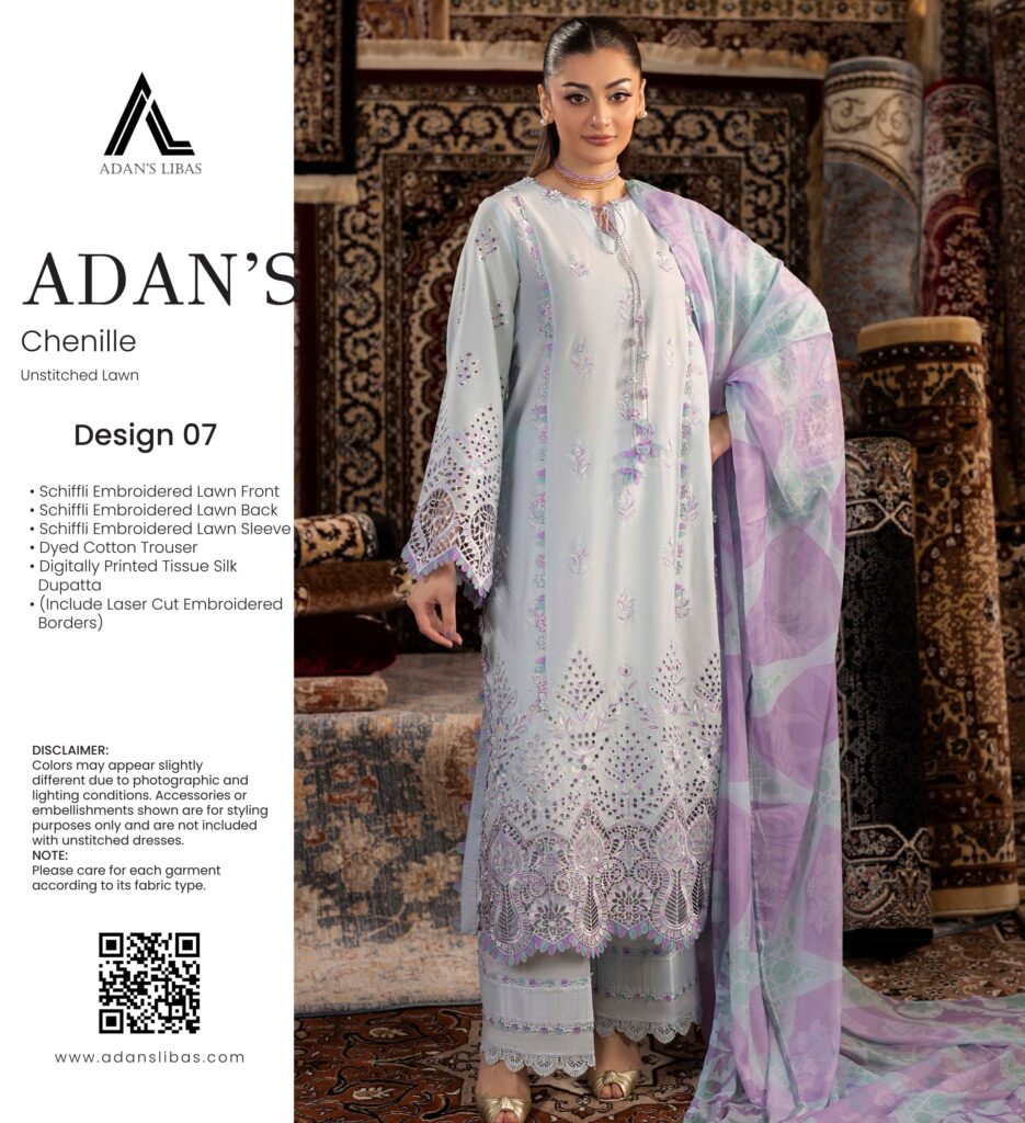 chenille luxury lawn design 07 PRICE 3,300 DESCRIPTION Schiffli Embroidered Lawn Front Schiffli Embroidered Lawn Back Schiffli Embroidered Lawn Sleeves Dyed Cotton Trouser Digitally Printed Tissue Silk Dupatta ( Include Laser Cut Embroidered Borders ) Buy Now
