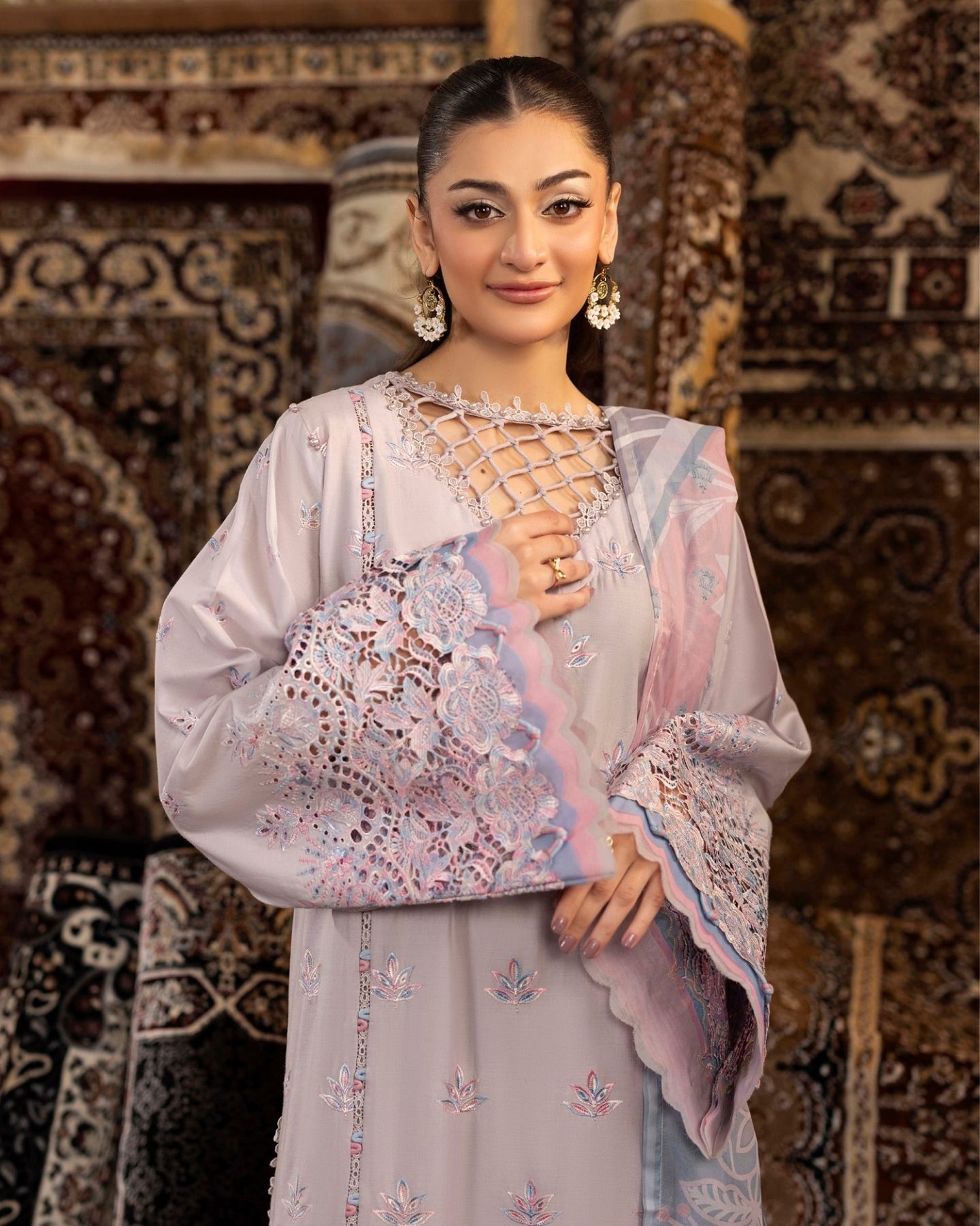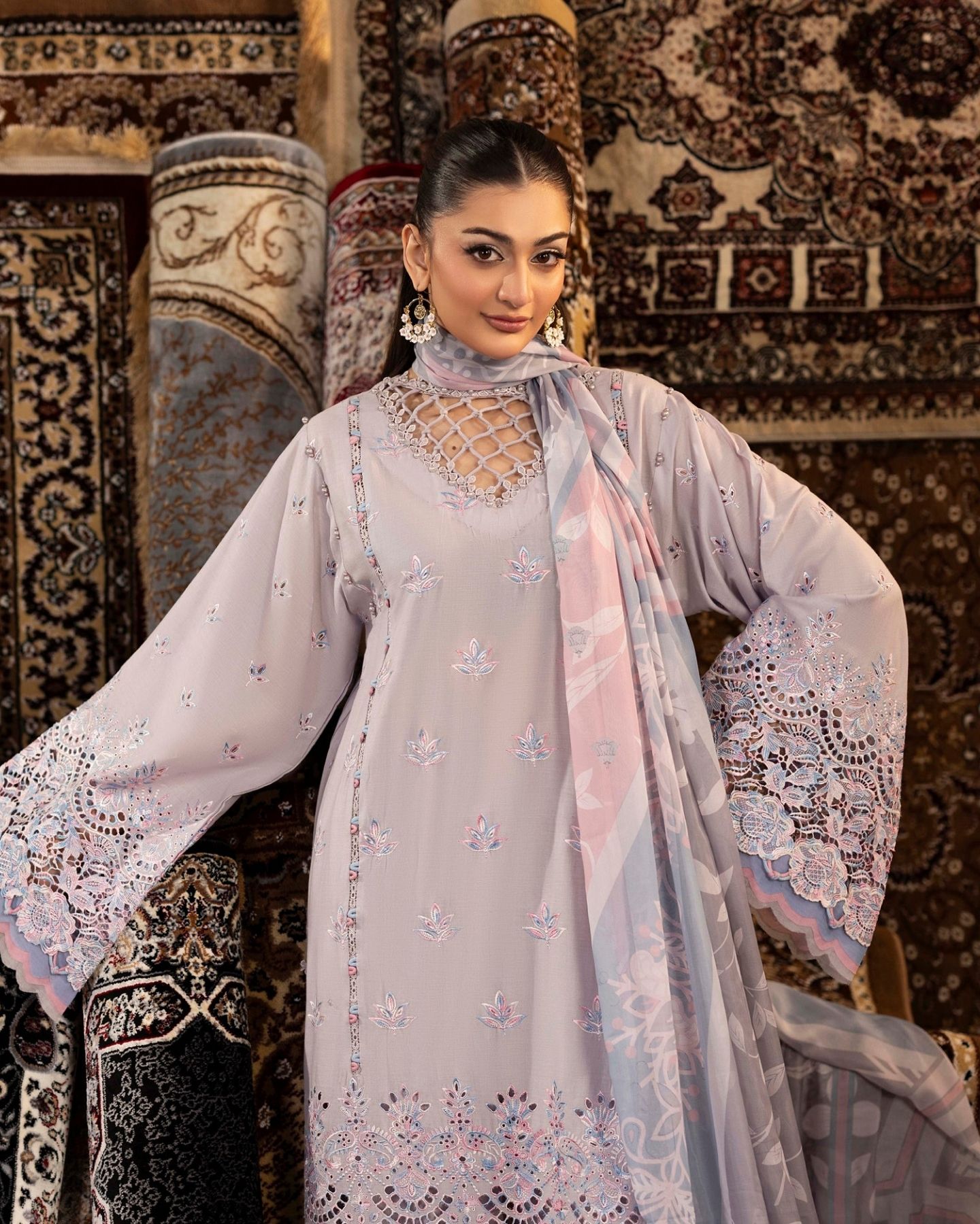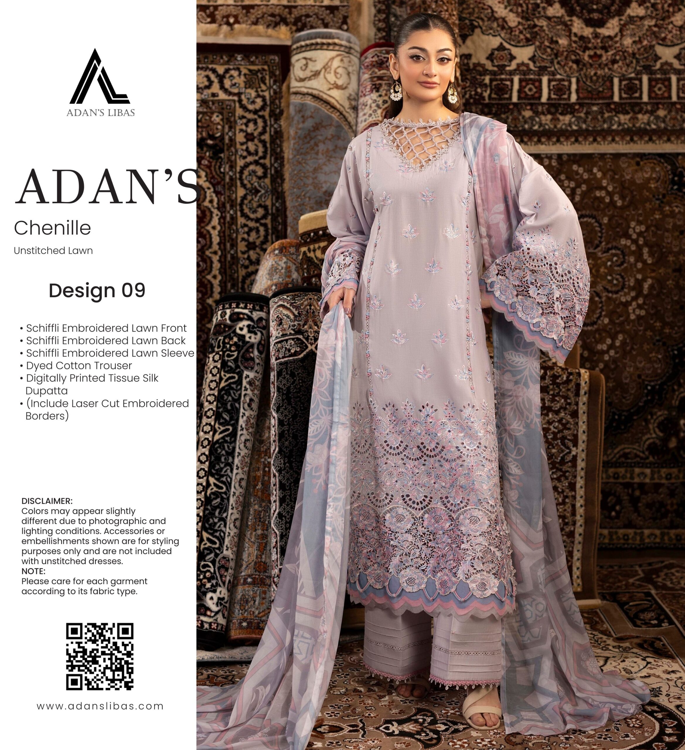 chenille luxury lawn design 09 PRICE 3,300 DESCRIPTION Schiffli Embroidered Lawn Front Schiffli Embroidered Lawn Back Schiffli Embroidered Lawn Sleeves Dyed Cotton Trouser Digitally Printed Tissue Silk Dupatta ( Include Laser Cut Embroidered Borders ) Buy Now