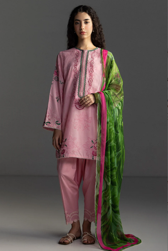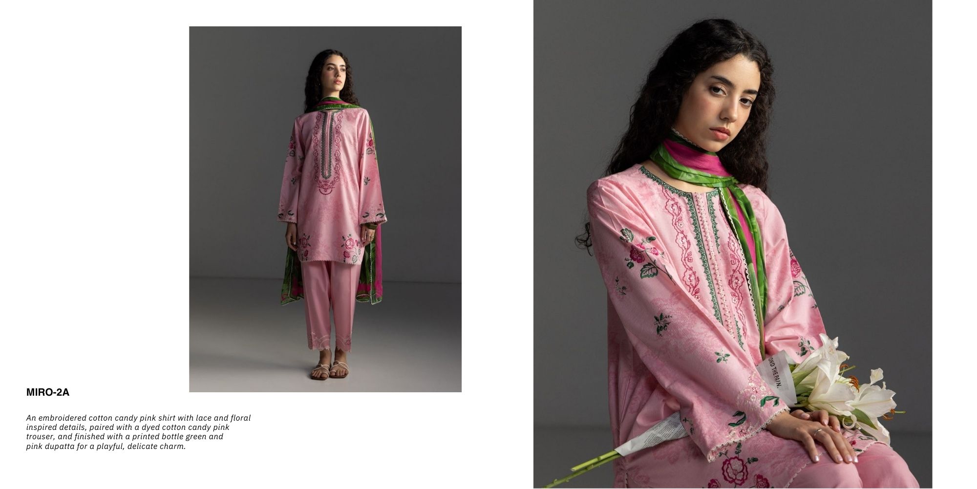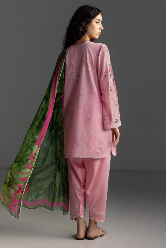 An embroidered cotton candy pink shirt with lace and floral inspired details, paired with a dyed cotton candy pink trouser, and finished with a printed bottle green and pink dupatta for a playful, delicate charm.