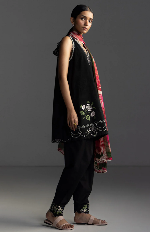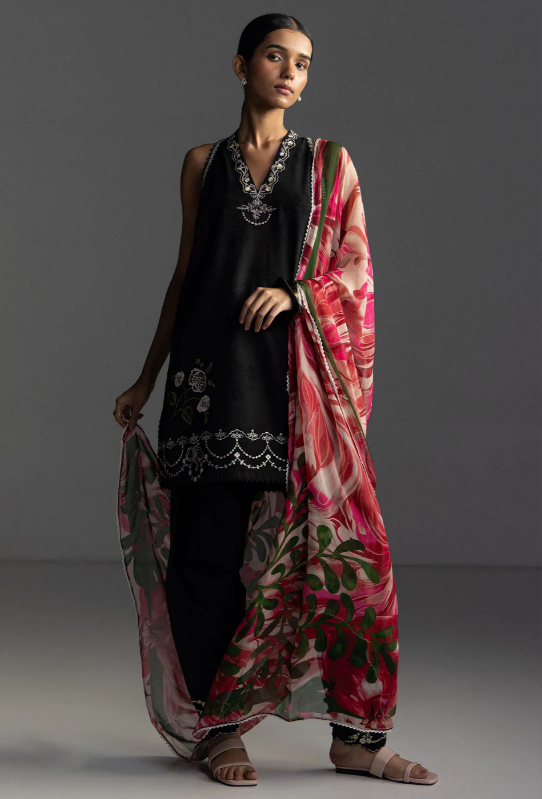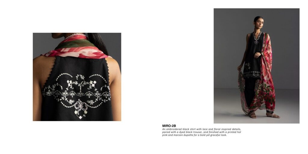 An embroidered black shirt with lace and floral inspired details, paired with a dyed black trouser, and finished with a printed hot pink and maroon dupatta for a bold yet graceful look.