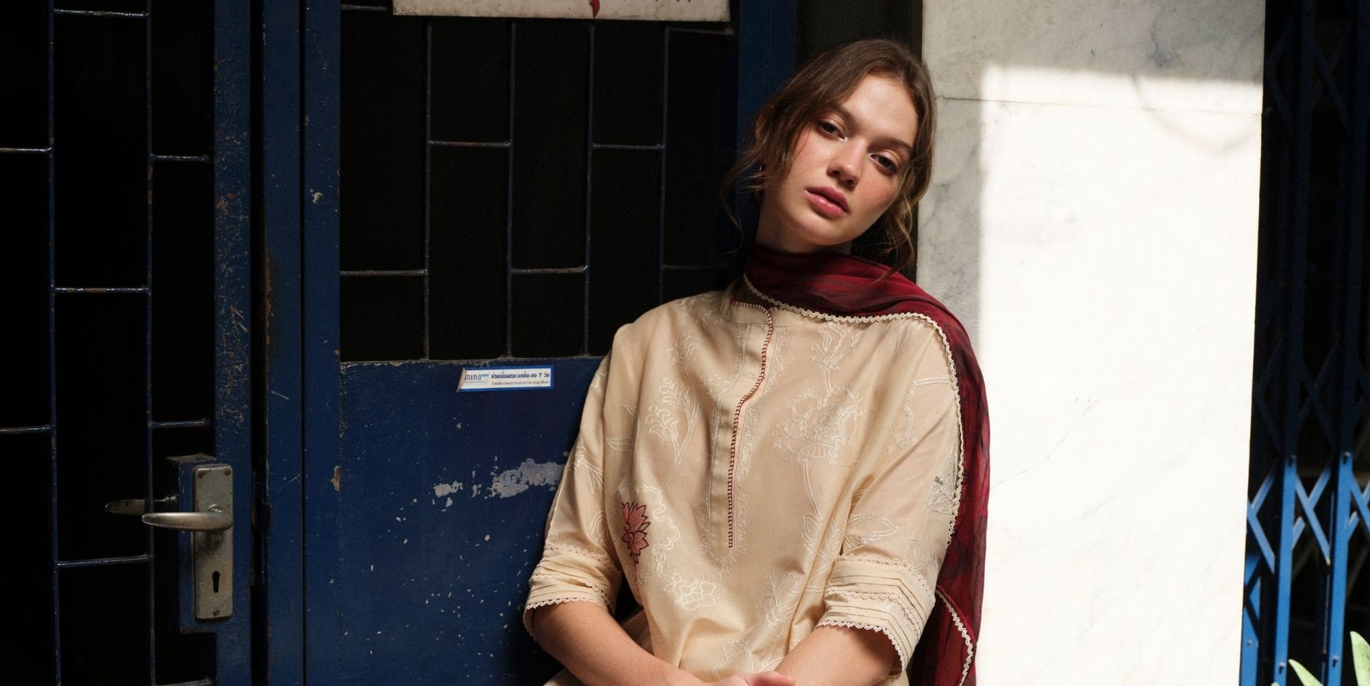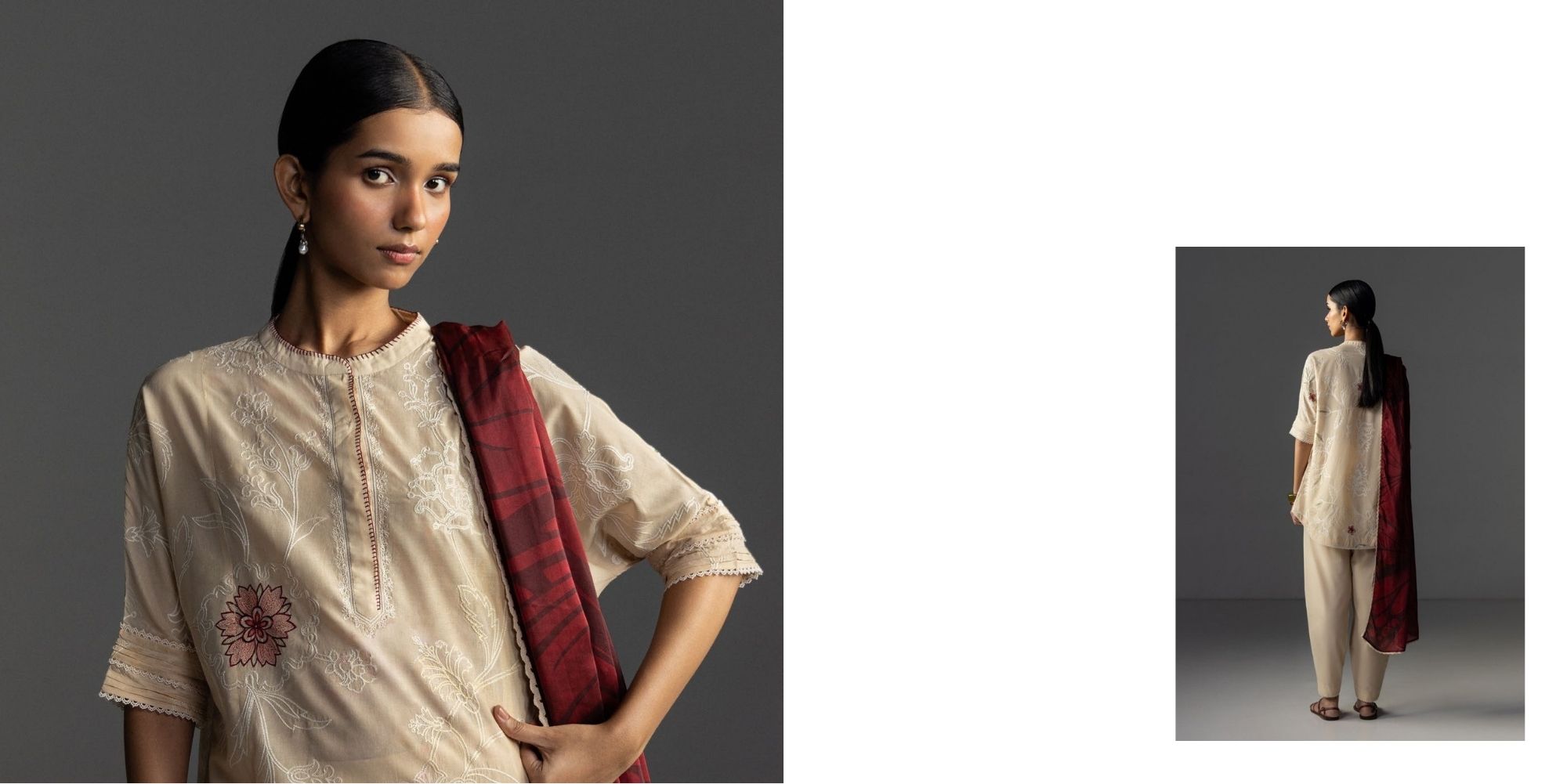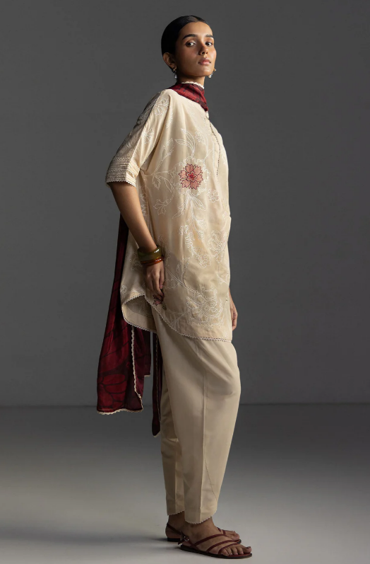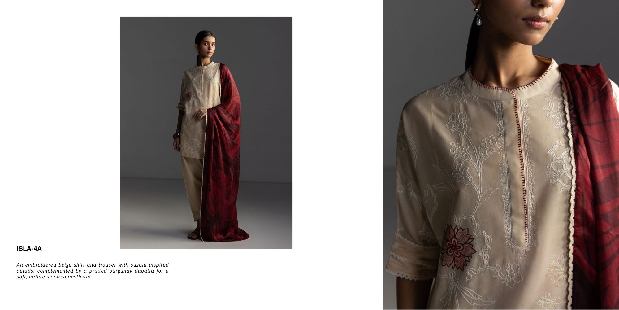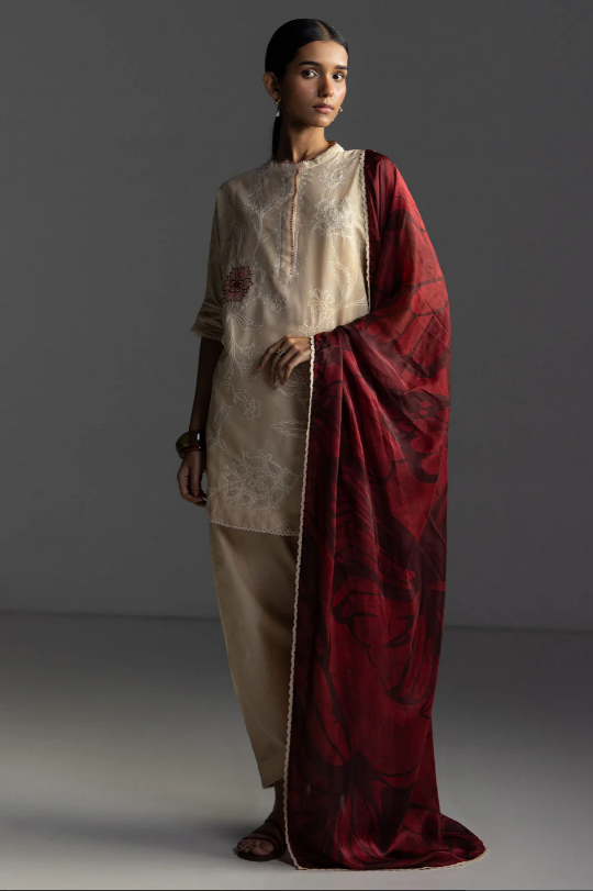 An embroidered beige shirt and trouser with suzani inspired details, complemented by a printed burgundy dupatta for a soft, nature inspired aesthetic.