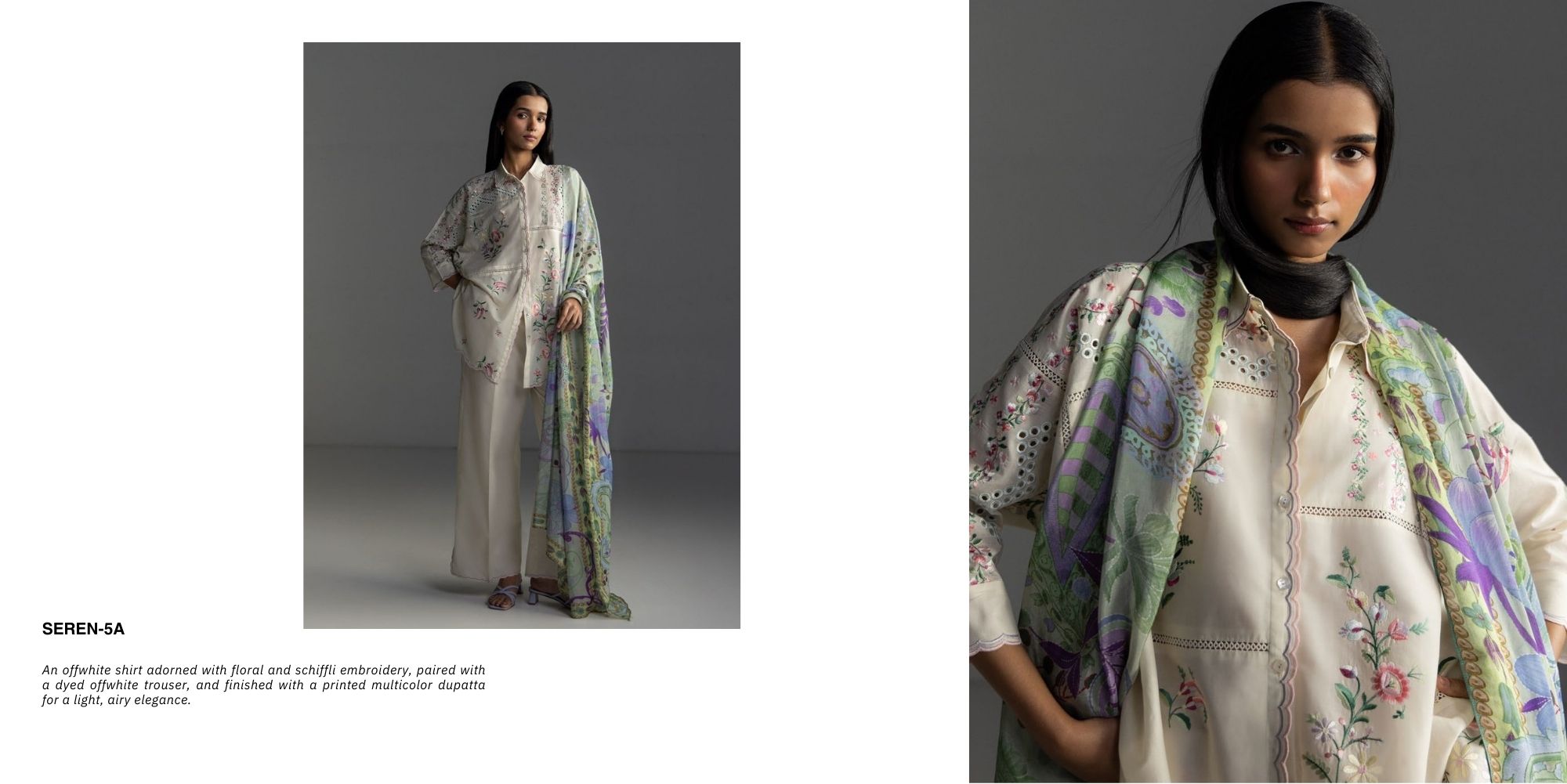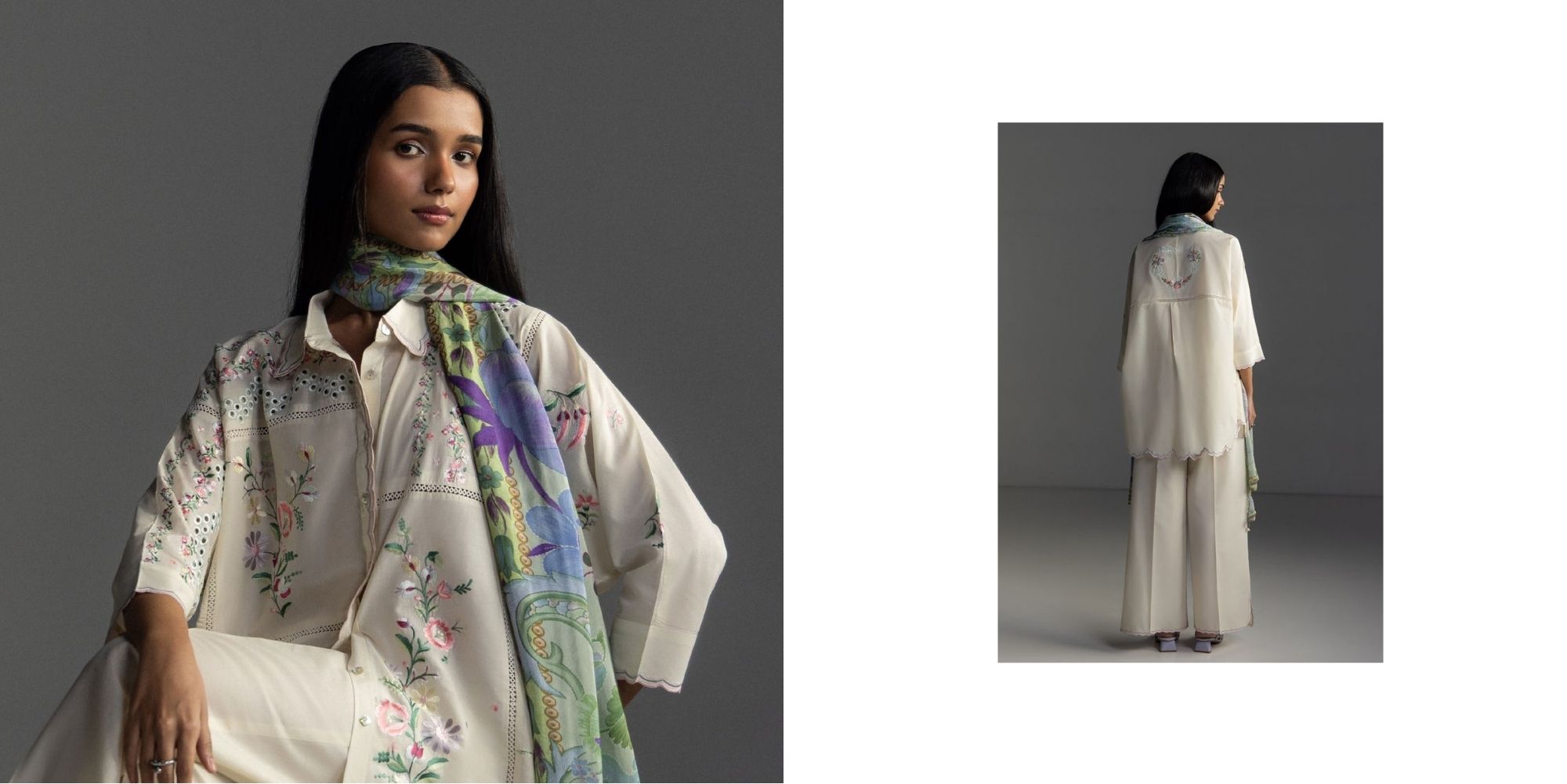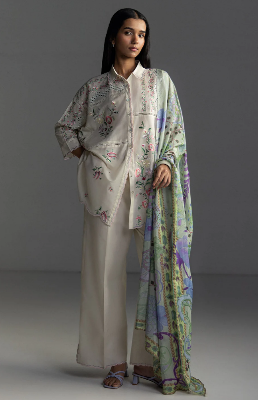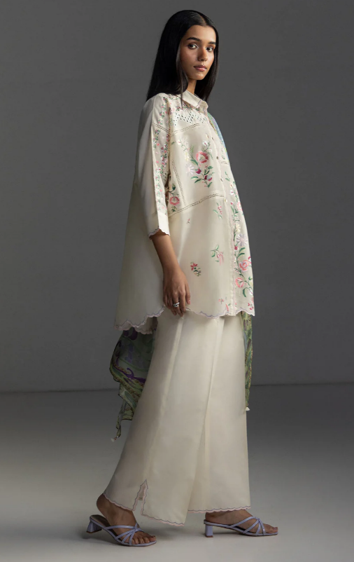 An offwhite shirt adorned with floral and schiffli embroidery, paired with a dyed offwhite trouser, and finished with a printed multicolor dupatta for a light, airy elegance.