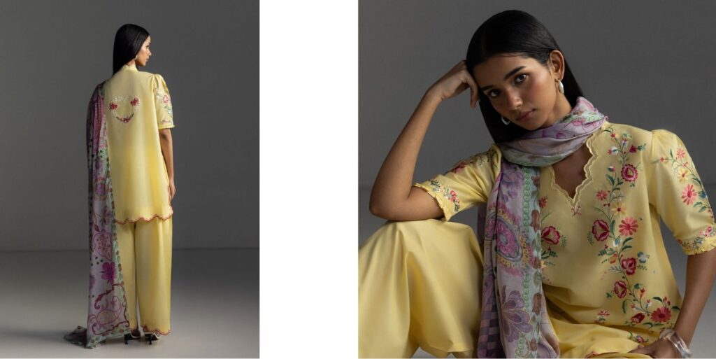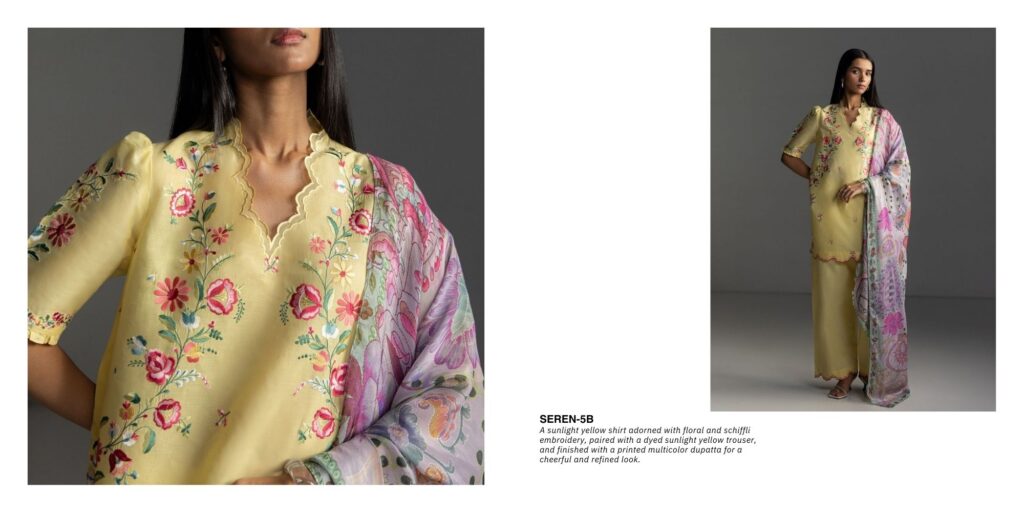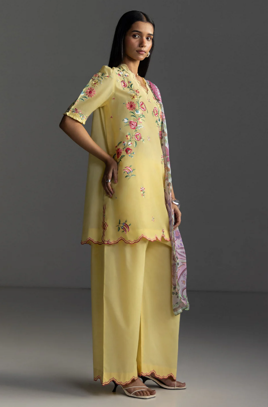 A sunlight yellow shirt adorned with floral and schiffli embroidery, paired with a dyed sunlight yellow trouser, and finished with a printed multicolor dupatta for a cheerful and refined look.
