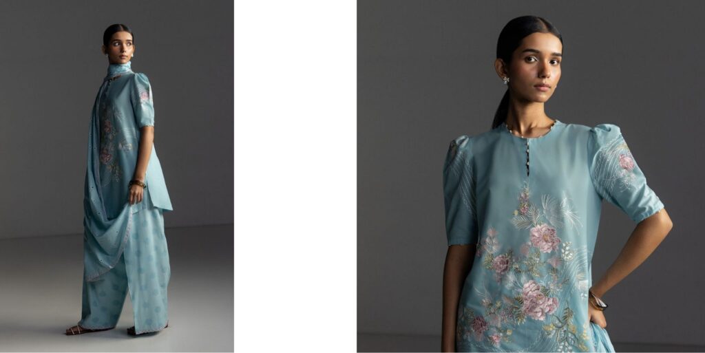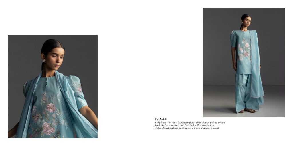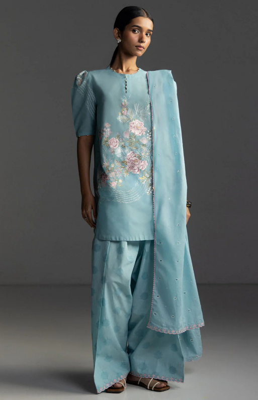 A sky blue shirt with Japanese floral embroidery, paired with a dyed sky blue trouser, and finished with a chikankari embroidered skyblue dupatta for a fresh, graceful appeal.