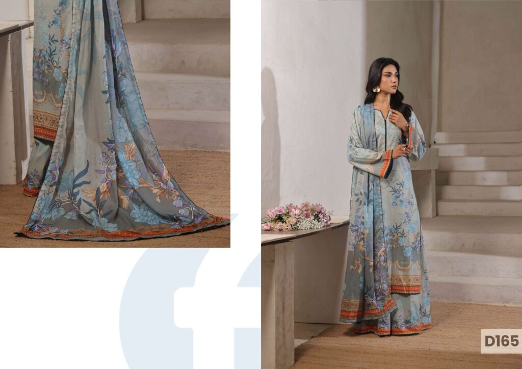 firdous solein prints design 165 PRICE 1,800 DESCRIPTION: Shirt: Printed Lawn Front, Back & Sleeves (3m)Dupatta: Printed Voile Dupatta (2.5m)Trousers: Dyed Cambric Trousers (2.5m Buy Now