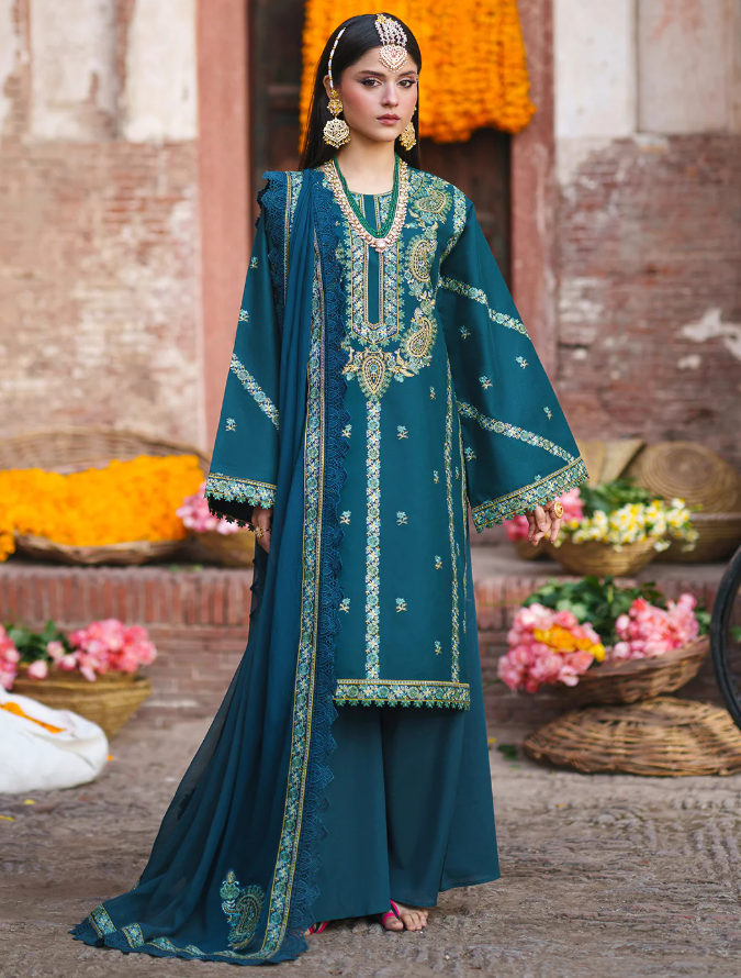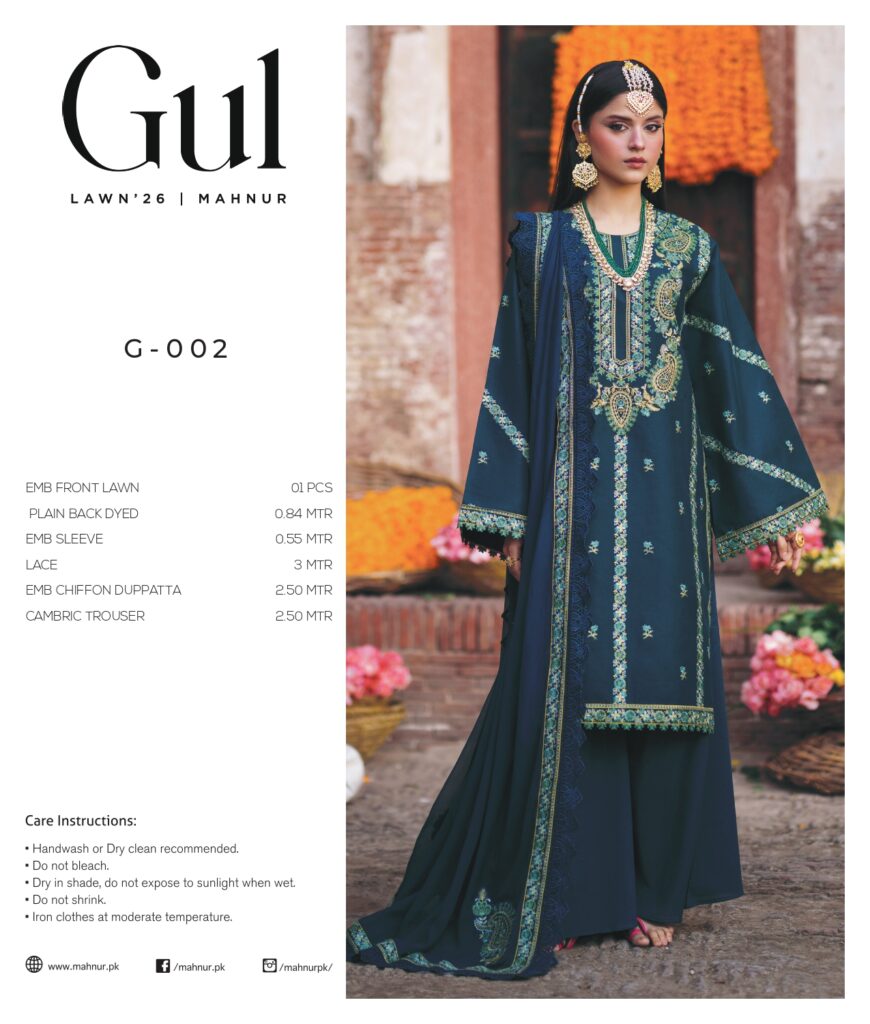 Gul Lawn G002 Price: 3600 Description Shirt: EMB FRONT LAWN 01 PCSPLAIN BACK DYED 0.84 MTREMB SLEEVE 0.55 MTRSLEEVE LACE 0.90 MTR Duppatta: EMB CHIFFON DUPPATTA 2.50 MTR Trouser: CAMBRIC TROUSER 2.50 MTR Buy Now