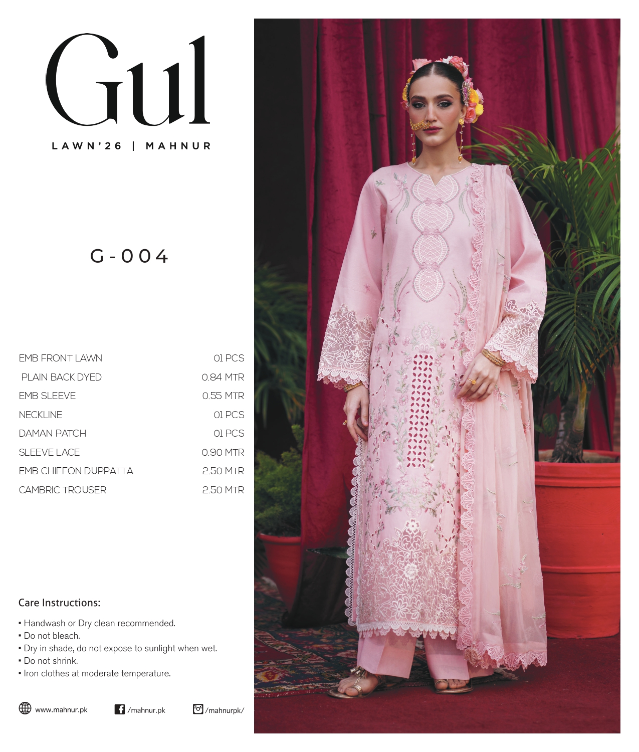 Gul Lawn G004 PRICE 3,600 Description Shirt: EMB FRONT LAWN 01 PCSPLAIN BACK DYED 0.84 MTREMB SLEEVE 0.55 MTRNECKLINE 01 PCSDAMAN PATCH 01 PCSSLEEVE LACE 0.90 MTR Duppatta: EMB CHIFFON DUPPATTA 2.50 MTR Buy Now