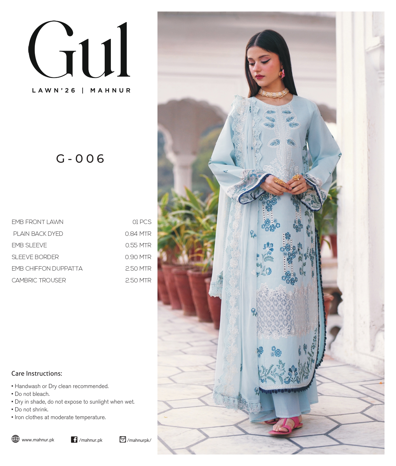 Gul Lawn G006 PRICE 3,600 Description SHIRT EMB FRONT LAWN 01 PCSPLAIN BACK DYED 0.84 MTREMB SLEEVE 0.55 MTRSLEEVE BORDER 0.90 MTR Duppatta: EMB CHIFFON DUPPATTA 2.50 MTR Trouser: CAMBRIC TROUSER 2.50 MTR Buy Now