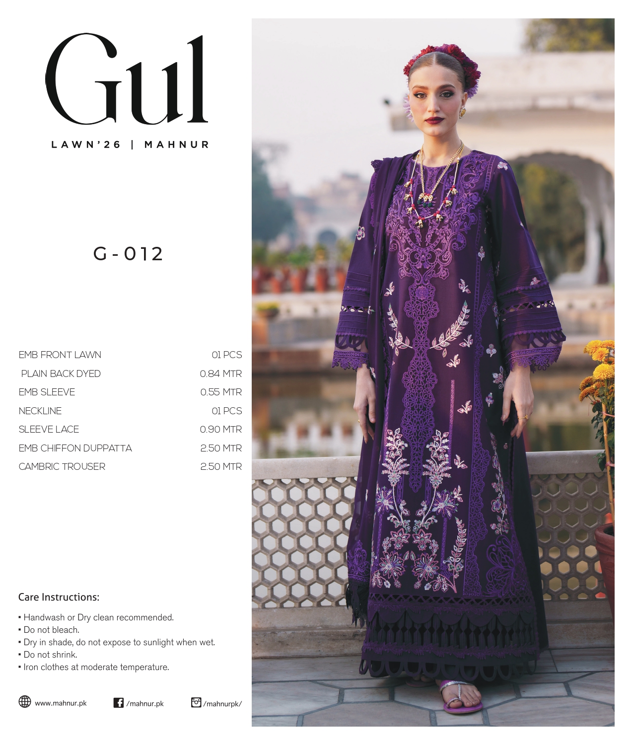 Gul Lawn G012 PRICE 3,600 Description Shirt: EMB FRONT LAWN 01 PCSPLAIN BACK DYED 0.84 MTREMB SLEEVE 0.55 MTRNECKLINE 01 PCSSLEEVE LACE 0.90 MTR Duppatta: EMB CHIFFON DUPPATTA 2.50 MTR Trouser: CAMBRIC TROUSER 2.50 MTR Buy Now