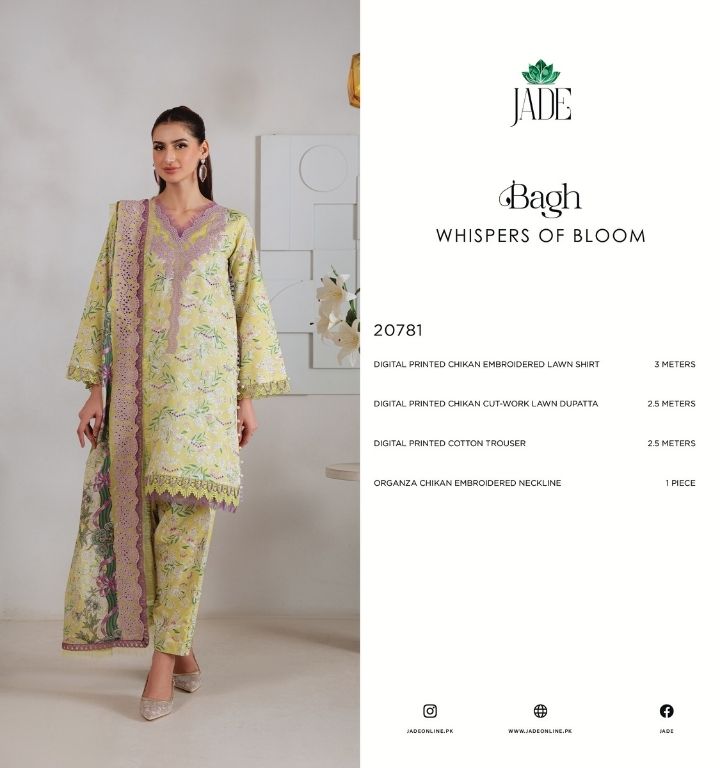 jade bagh whispeers of bloom lawn design 20781 PRICE 3,200 DESCRIPTION 3M Digital Printed Chikan Embroidered Lawn Shirt2.5M Digital Printed Chikan Cut-Work Lawn Dupatta2.5M Digital Printed Cotton Trouser01PC Organza Chikan Embroidered Neckline Buy Now