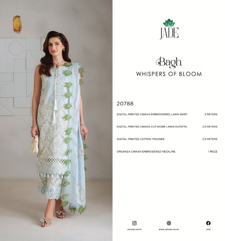 jade bagh whispeers of bloom lawn design 20788 PRICE 3,200 DESCRIPTION: 3M Digital Printed Chikan Embroidered Lawn Shirt2.5M Digital Printed Chikan Cut-Work Lawn Dupatta2.5M Digital Printed Cotton Trouser01PC Organza Chikan Embroidered Neckline Buy Now