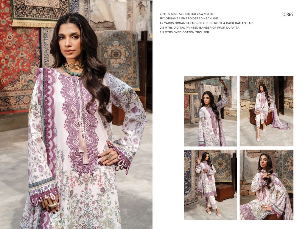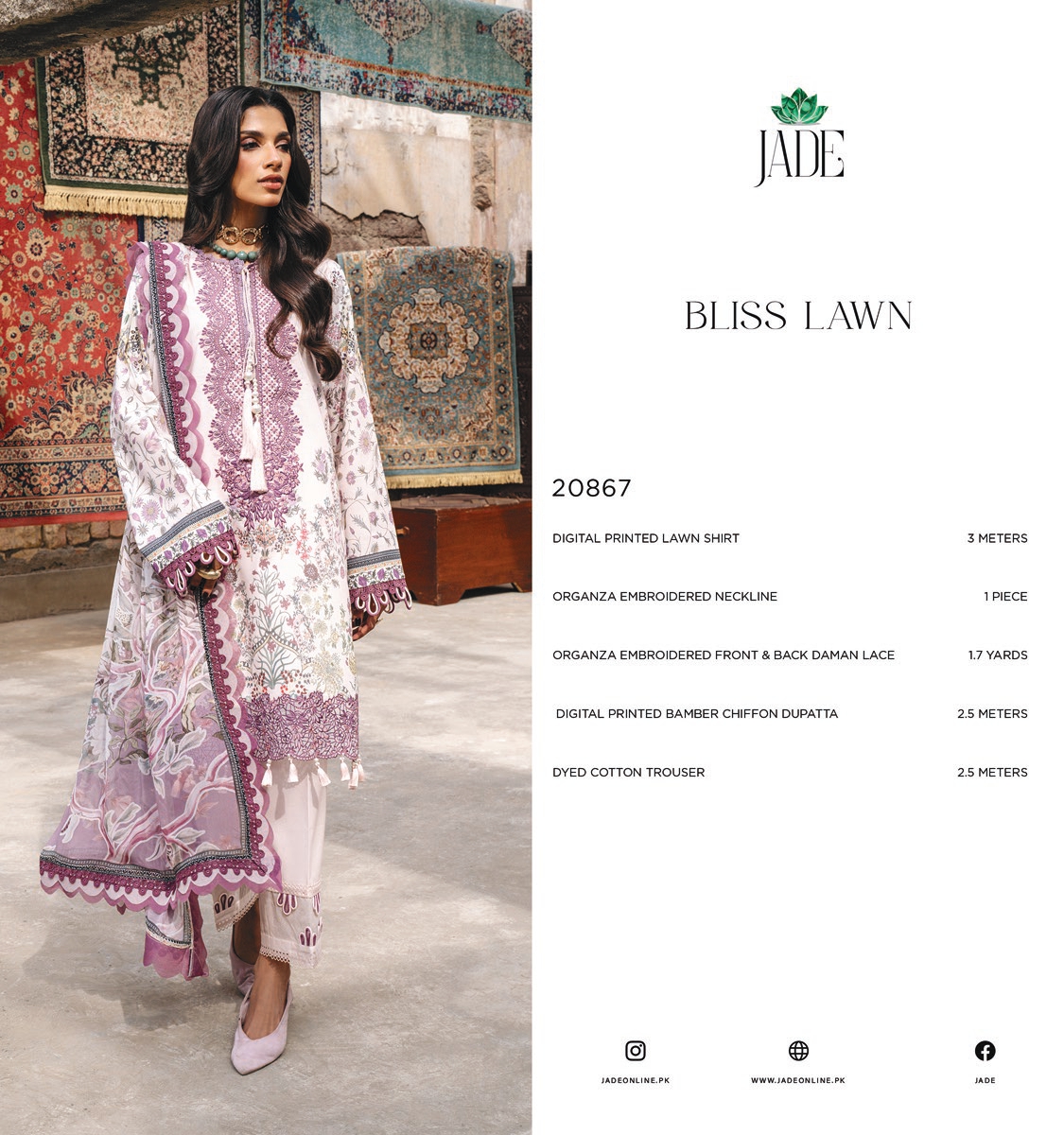 Jade Bliss 20867 Digital Printed Lawn ShirtOrganza Embroidered NeckLineOrganza Embroidered Front & Back Daman LaceDigital Printed Bamber Chiffon DupattaDyed Cotton TrouserPrice 2,600 Buy Now