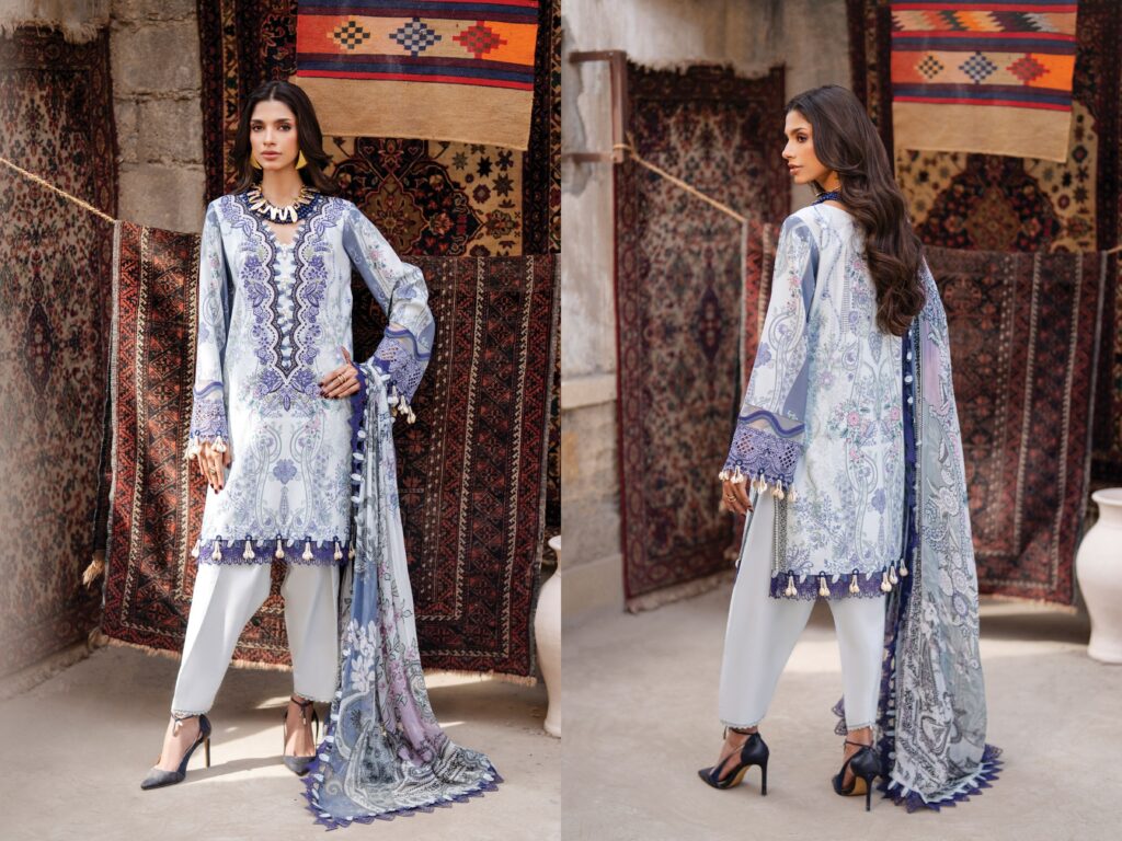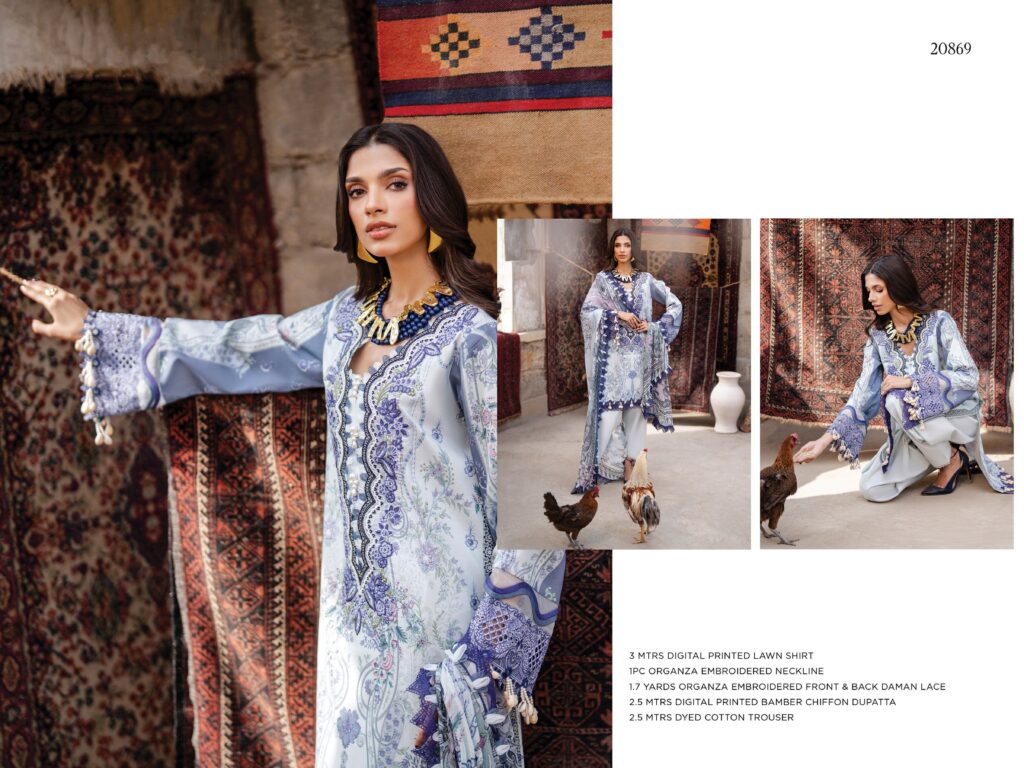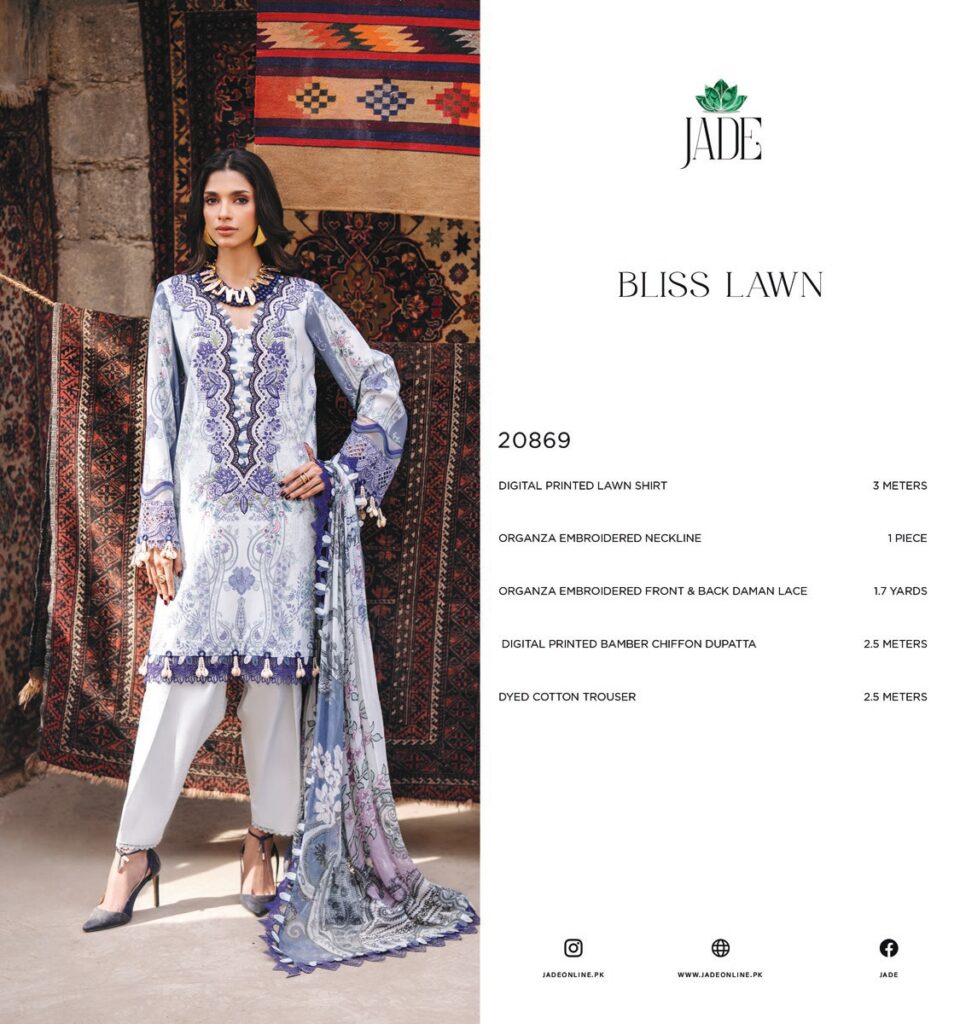 Jade Bliss 20869 Digital Printed Lawn ShirtOrganza Embroidered NeckLineOrganza Embroidered Front & Back Daman LaceDigital Printed Bamber Chiffon DupattaDyed Cotton TrouserPrice 2,600 Buy Now