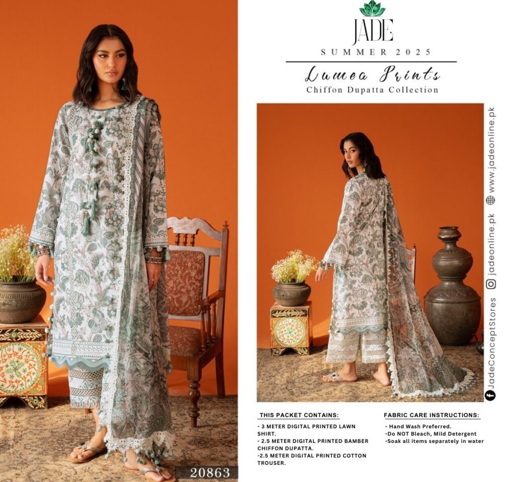 | Fabric: 3 Meter Digital Printed Lawn Shirt 2.5 Meter Digital Printed Bamber Chiffon Dupatta 2.5 Meter Digital Printed Cotton Trouser |