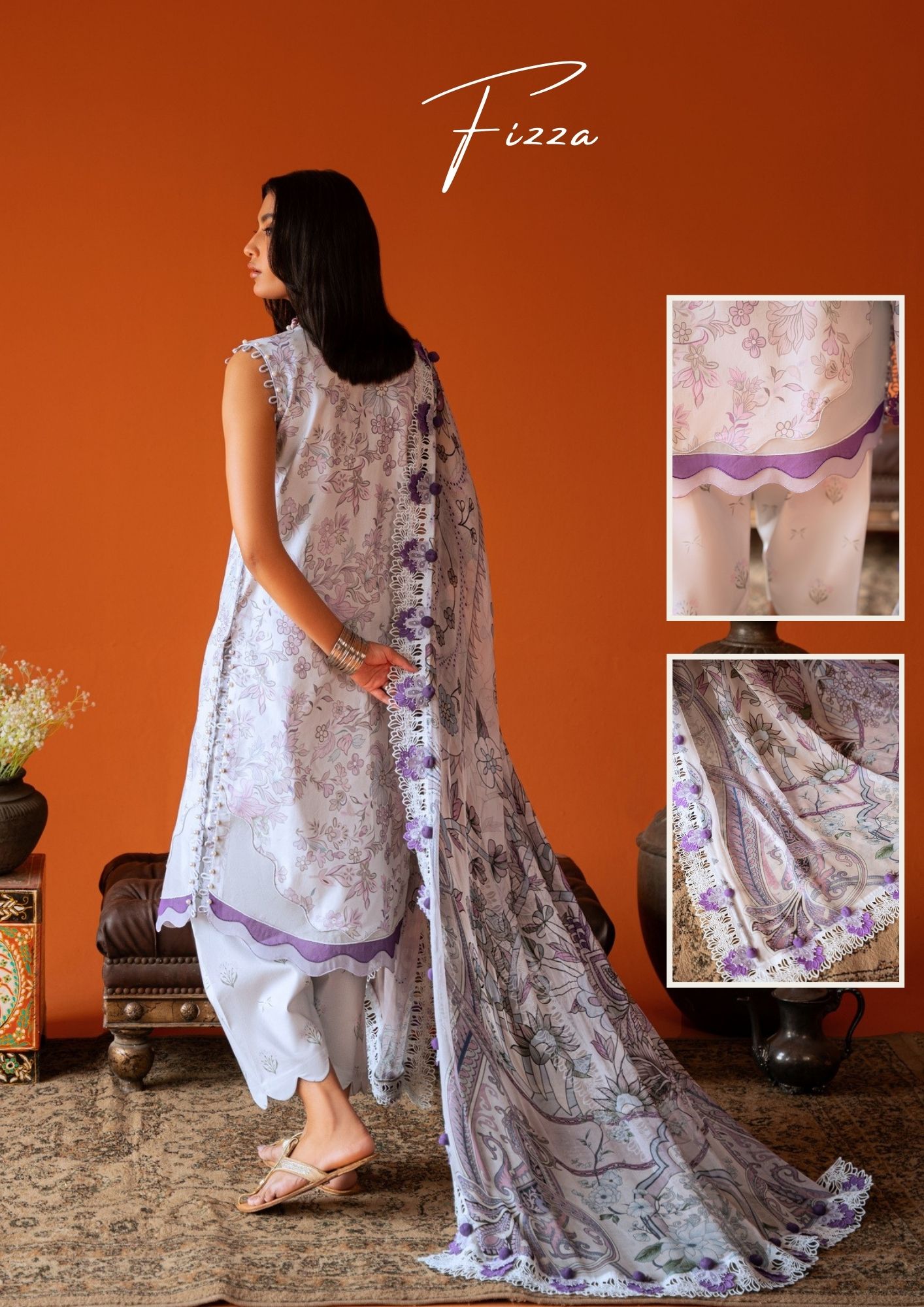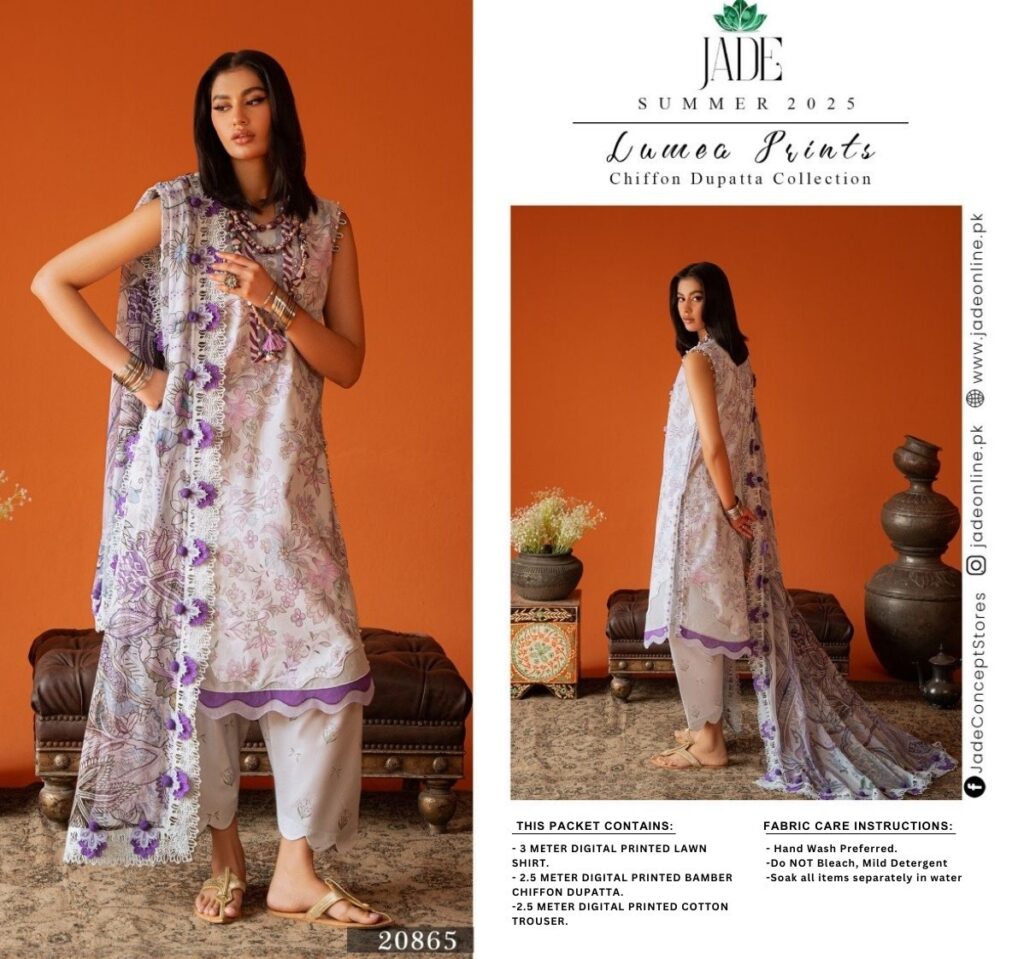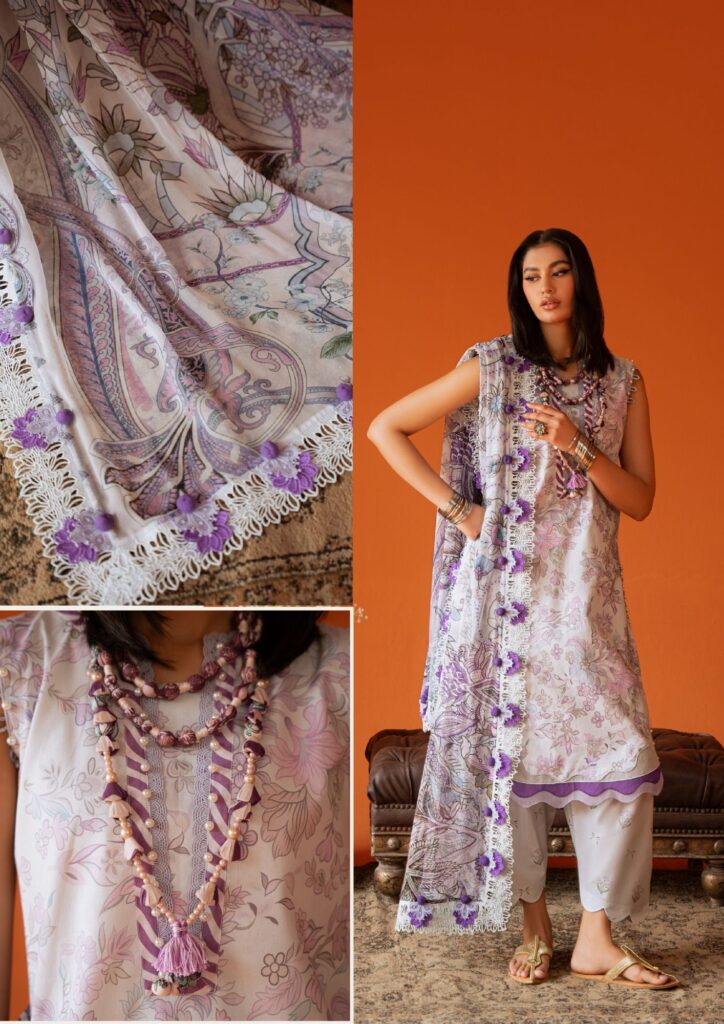| Fabric: 3 Meter Digital Printed Lawn Shirt 2.5 Meter Digital Printed Bamber Chiffon Dupatta 2.5 Meter Digital Printed Cotton Trouser |