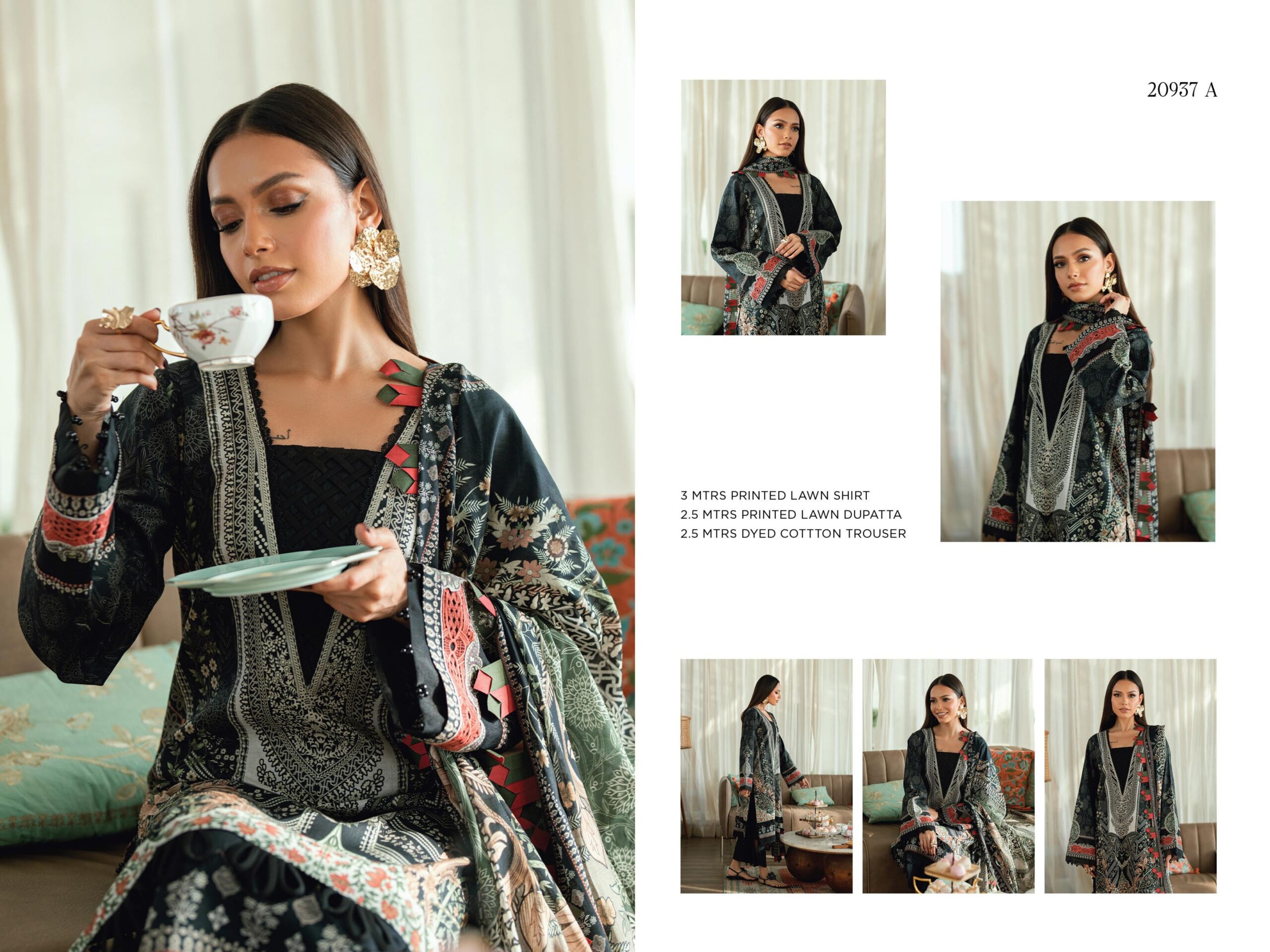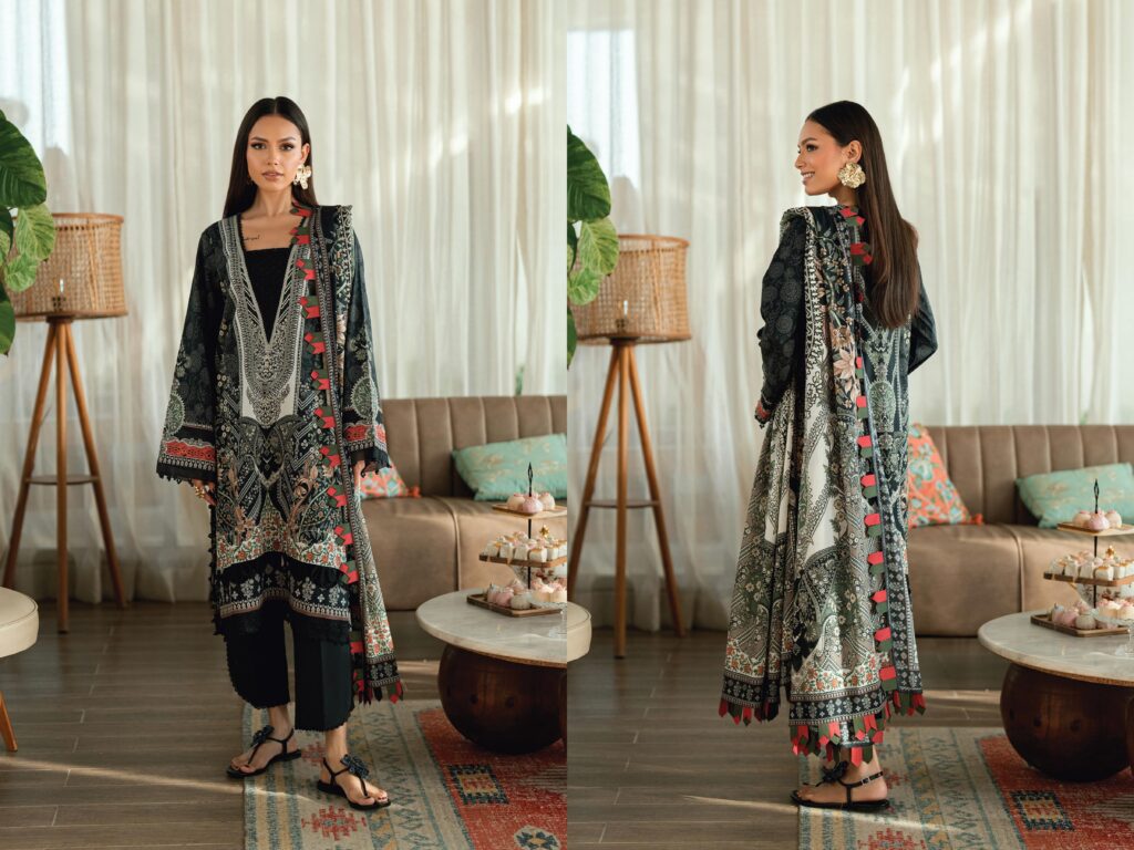| Fabric: 3 METER DIGITAL PRINTED LAWN SHIRT 2.5 ΜΕTER DIGITAL PRINTED LAWN DUPATTA 2.5 ΜΕΤTER DYED COTTON TROUSER |
