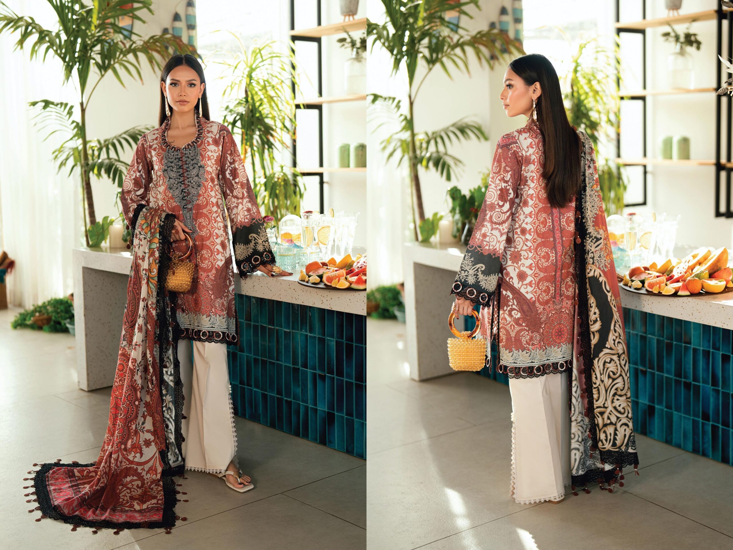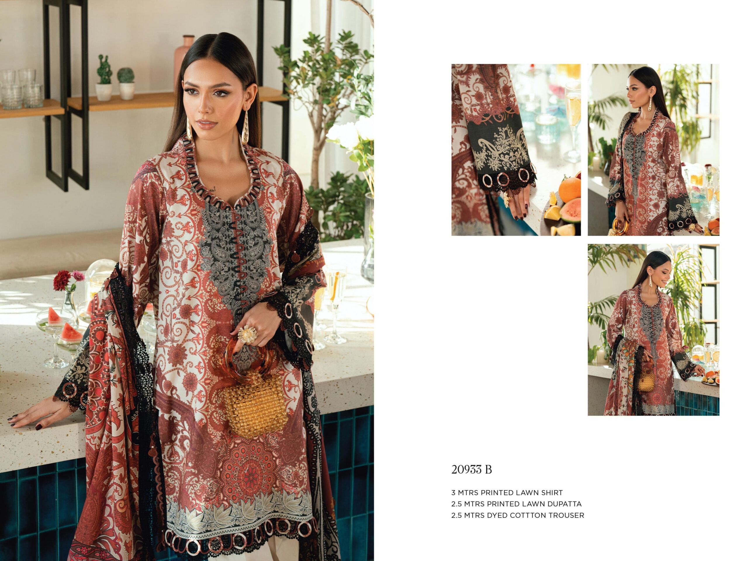 | Fabric: 3 METER DIGITAL PRINTED LAWN SHIRT 2.5 ΜΕTER DIGITAL PRINTED LAWN DUPATTA 2.5 ΜΕΤTER DYED COTTON TROUSER |