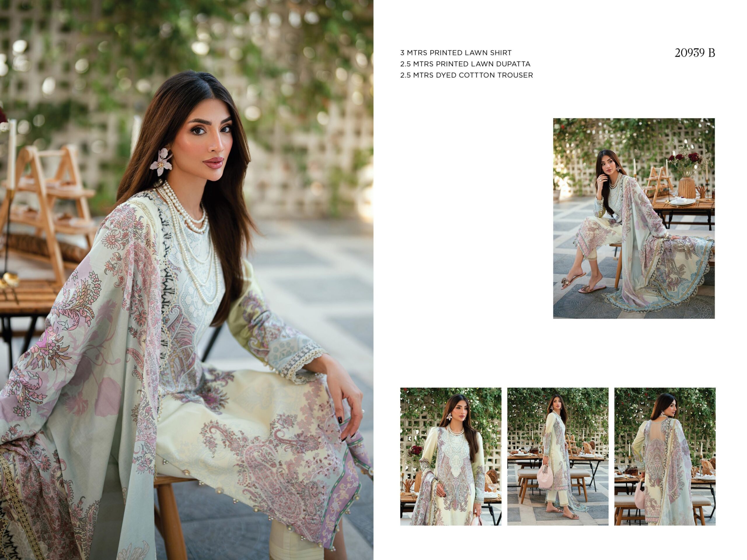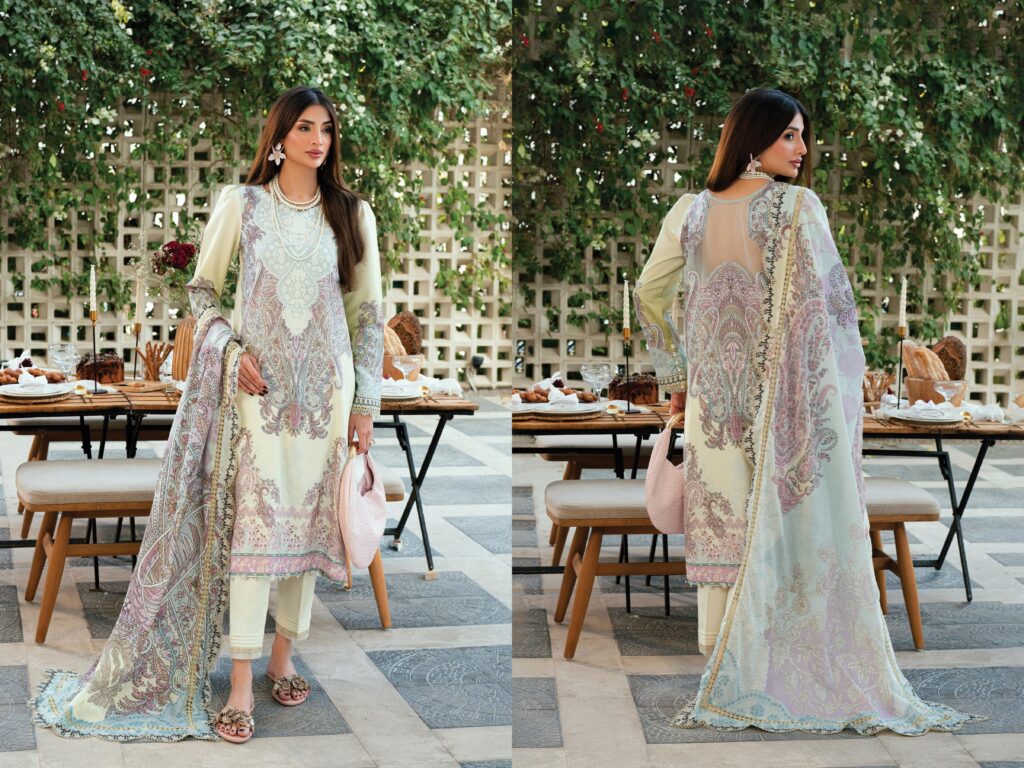 | Fabric: 3 METER DIGITAL PRINTED LAWN SHIRT 2.5 ΜΕTER DIGITAL PRINTED LAWN DUPATTA 2.5 ΜΕΤTER DYED COTTON TROUSER |