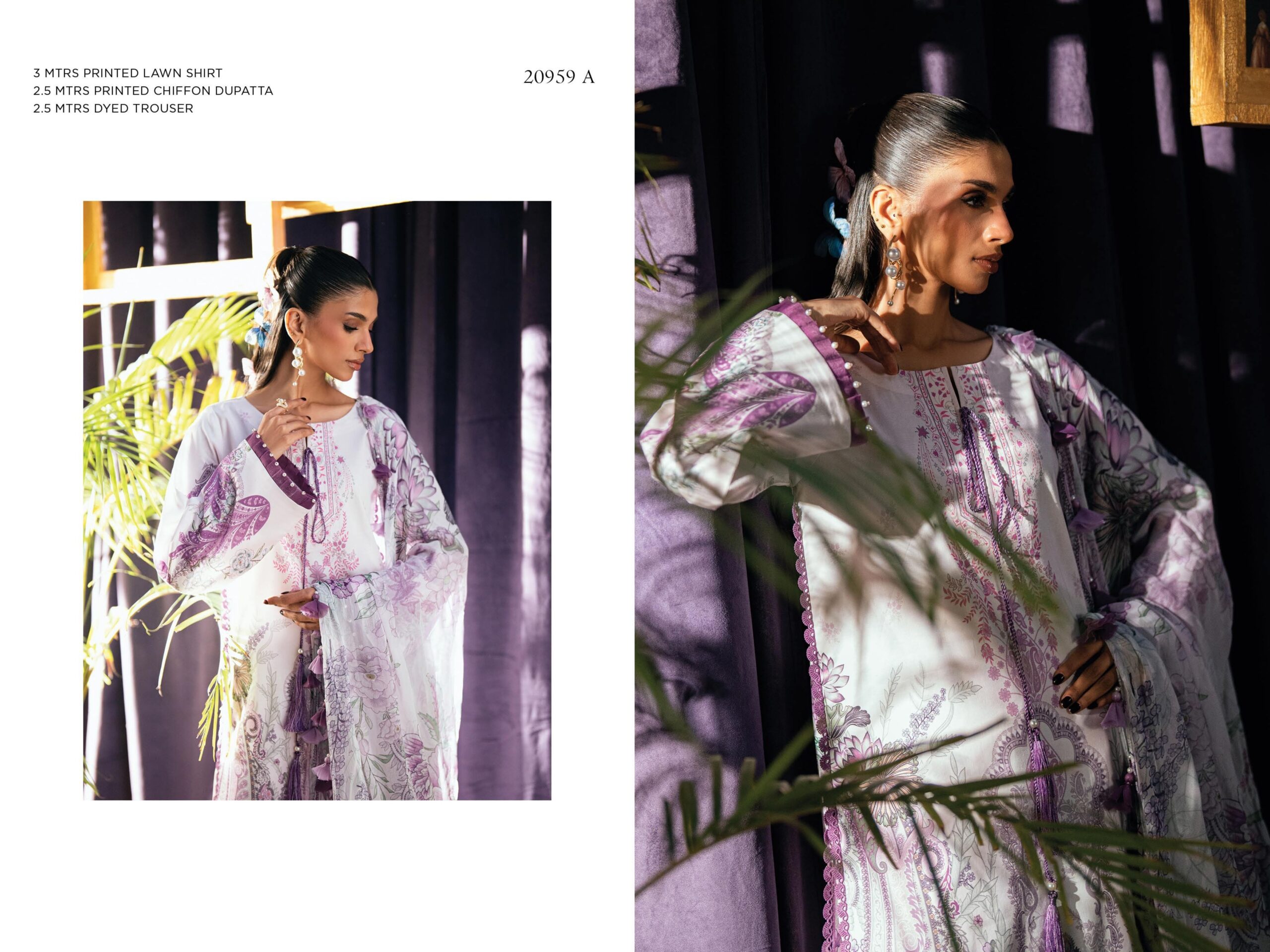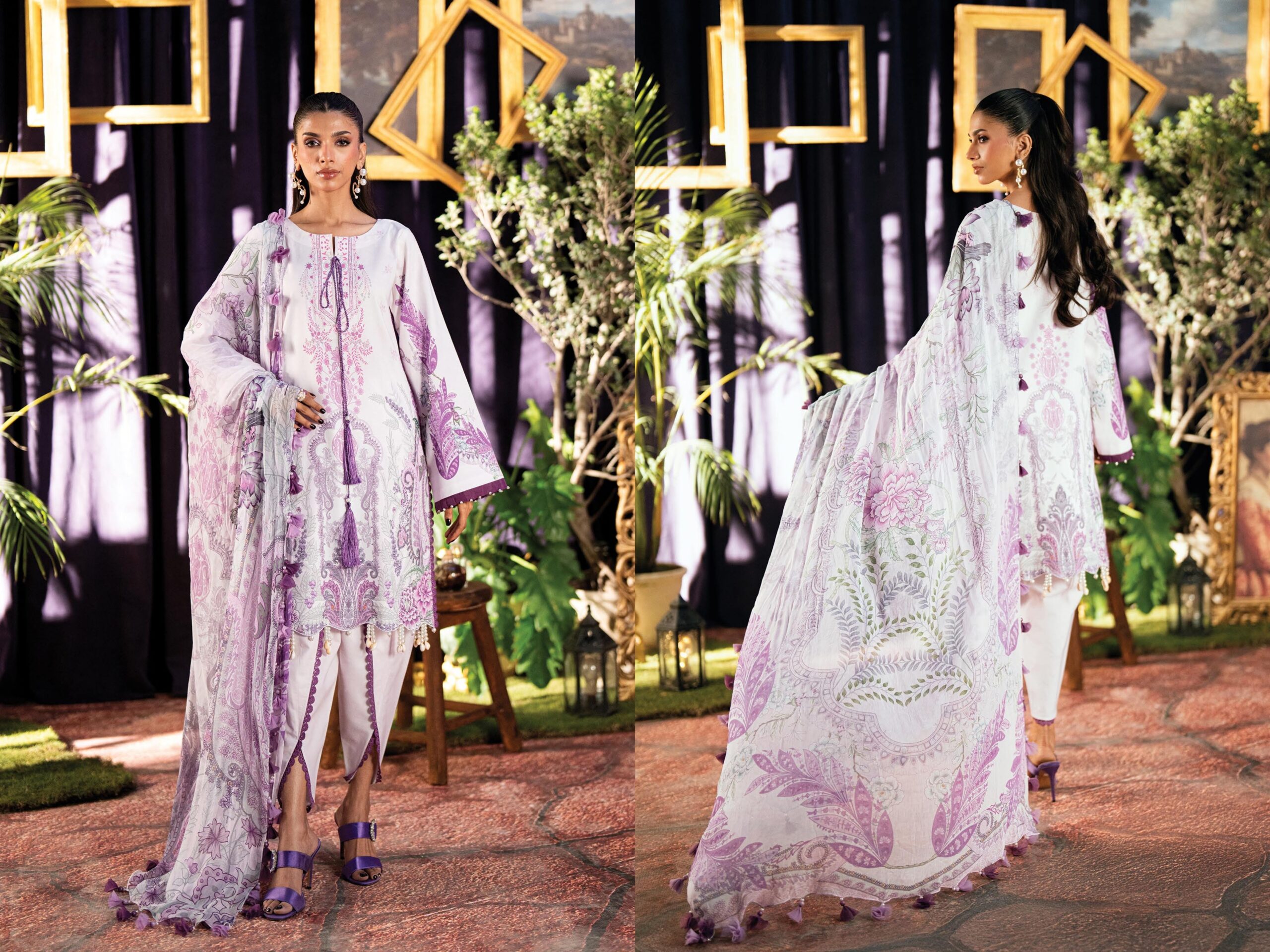 | Fabric: 3M Digital Printed Lawn Shirt 2.5M Digital Printed Bamber Chiffon Dupatta 2.5M Dyed Cotton Trouser |