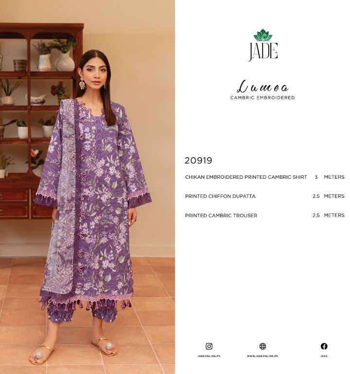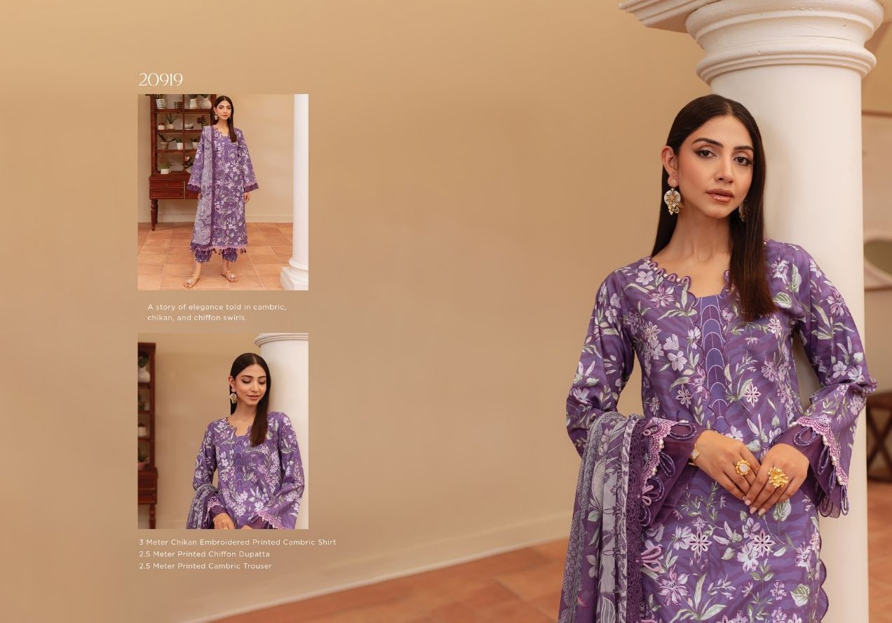 lumea cambric 20919 PRICE 2,400 Description 100% Original Guaranteed Unstitched Dress Material 3M Digital Printed Embroidered Cambric Shirt2.5M Digital Printed Chiffon Dupatta2.5M Dyed Cambric Trouser Buy Now