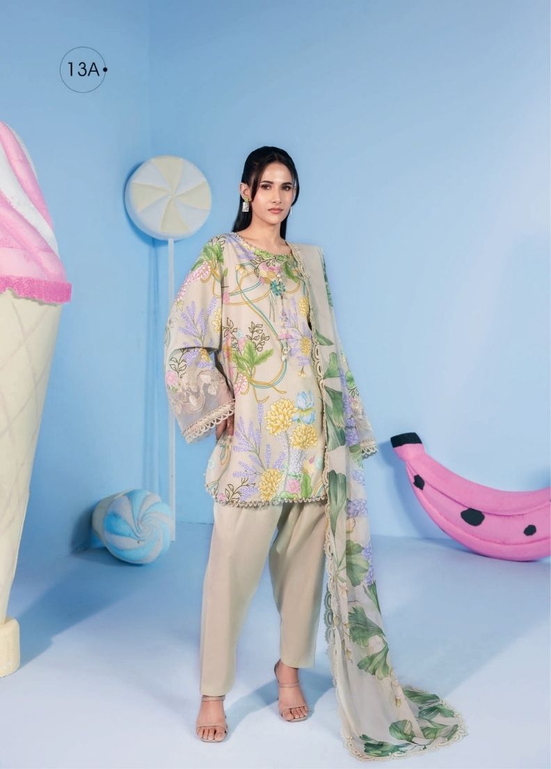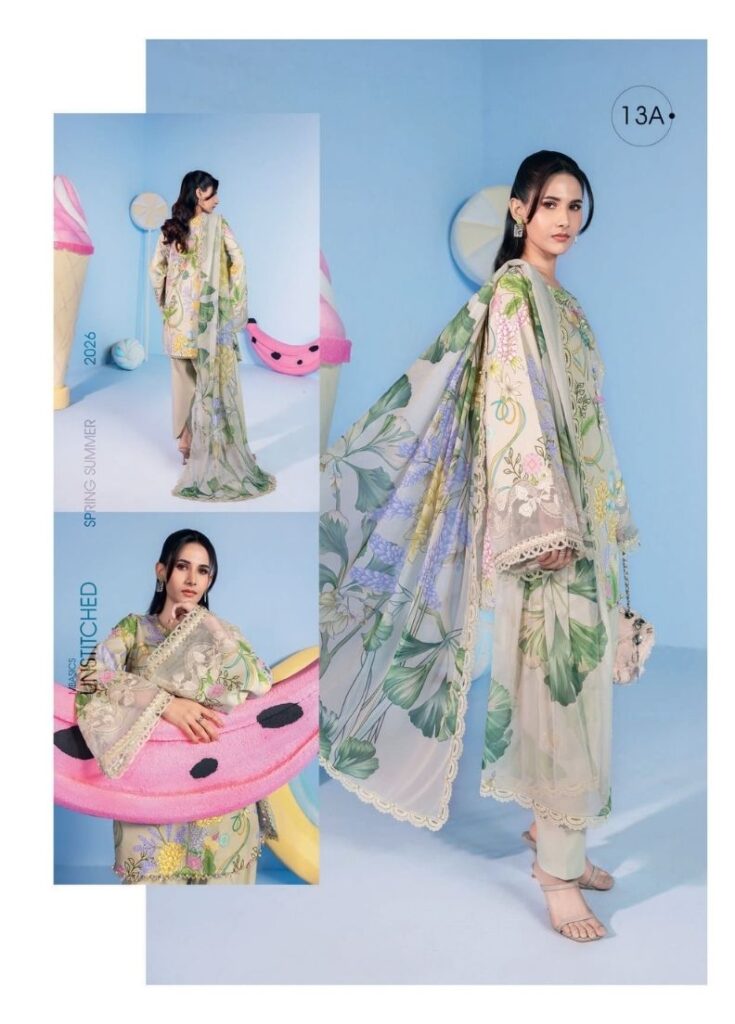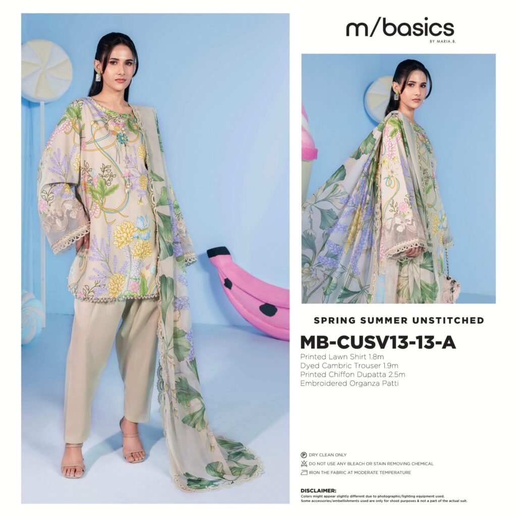 M BASICS BY MARIA B UNSTITCHED’26 13A PRICE 2,500 DESCRIPTION– Printed Lawn Shirt 1.8mDyed Cambric Trouser 1.5mPrinted Chiffon Dupatta 2.5mEmbroidered Organza Patti SIZE- Unstitched fabric / Unstitched Dress Material Buy Now