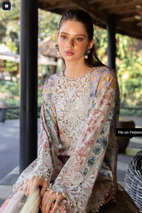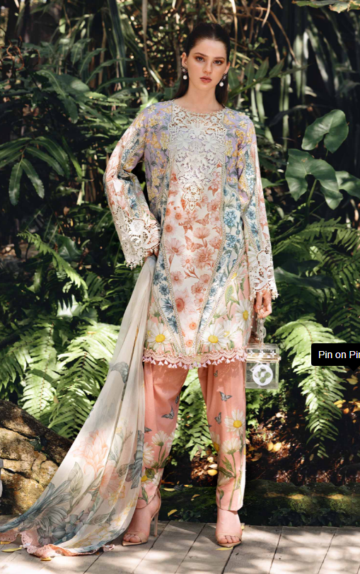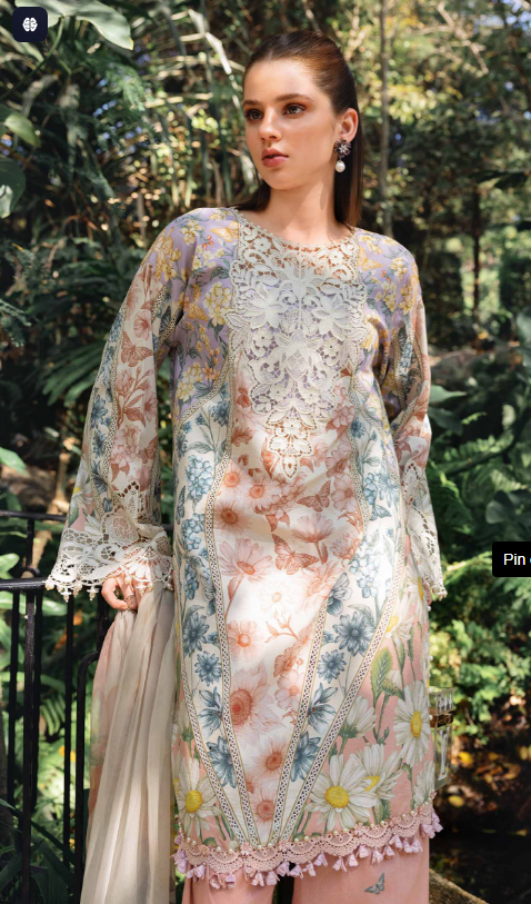 mariab mprints lawn design 10B PRICE 4,300 Description Color: White & PeachShirtPrinted Lawn ShirtEmbroidered NecklineEmbroidered PatchesTrouserPrinted Cambric TrouserDupattaPrinted Chiffon DupattaNote: Dry Clean Only Buy Now
