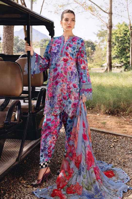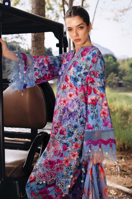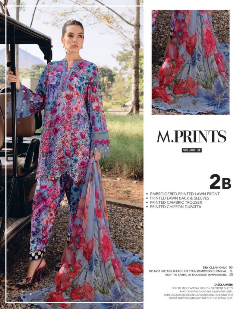 mariab mprints lawn design 2B PRICE 4,300 Description Color: BlueShirtEmbroidered Printed Lawn FrontPrinted Lawn Back & SleevesTrouserPrinted Cambric TrouserDupattaPrinted Chiffon DupattaNote: Dry Clean Only Buy Now