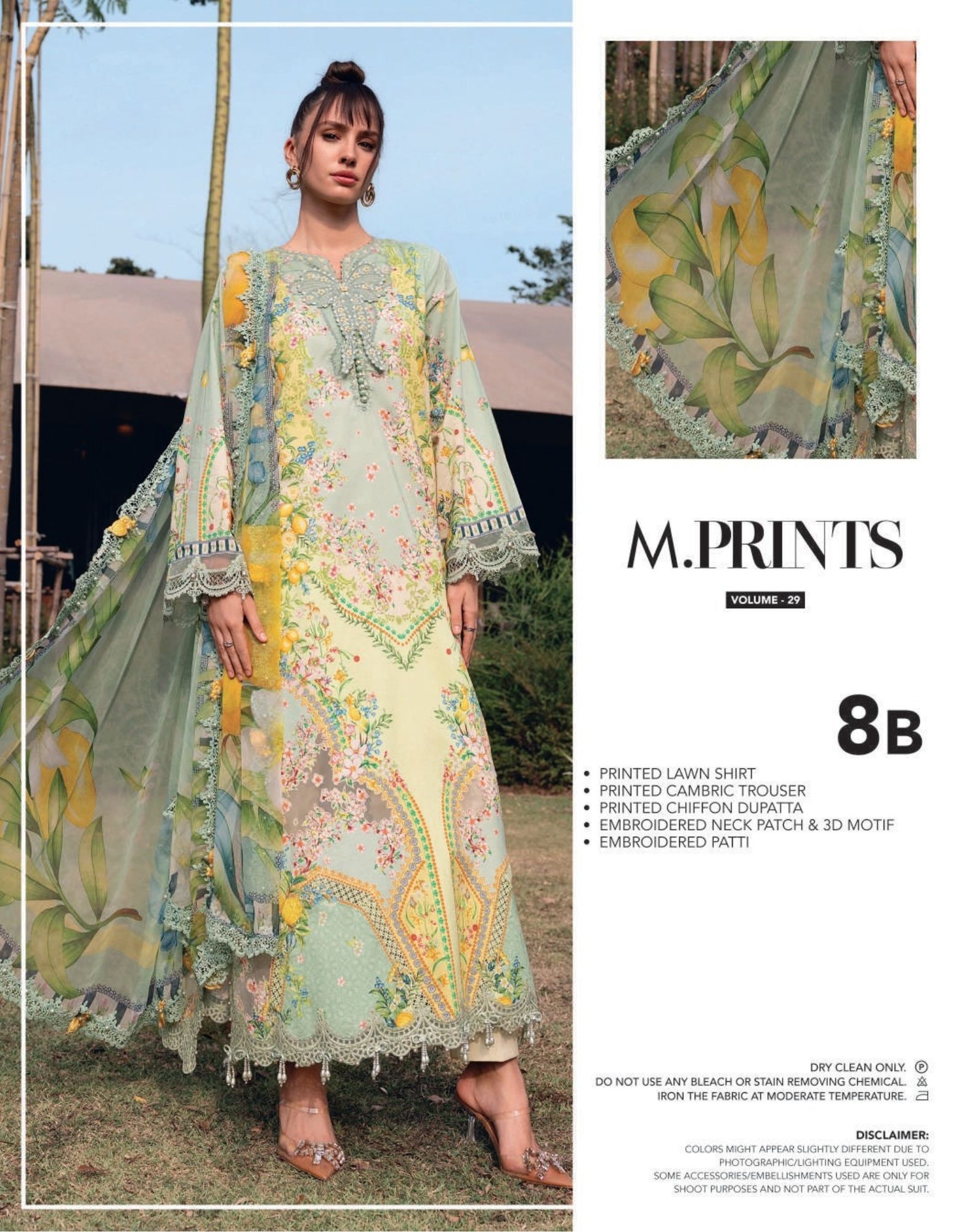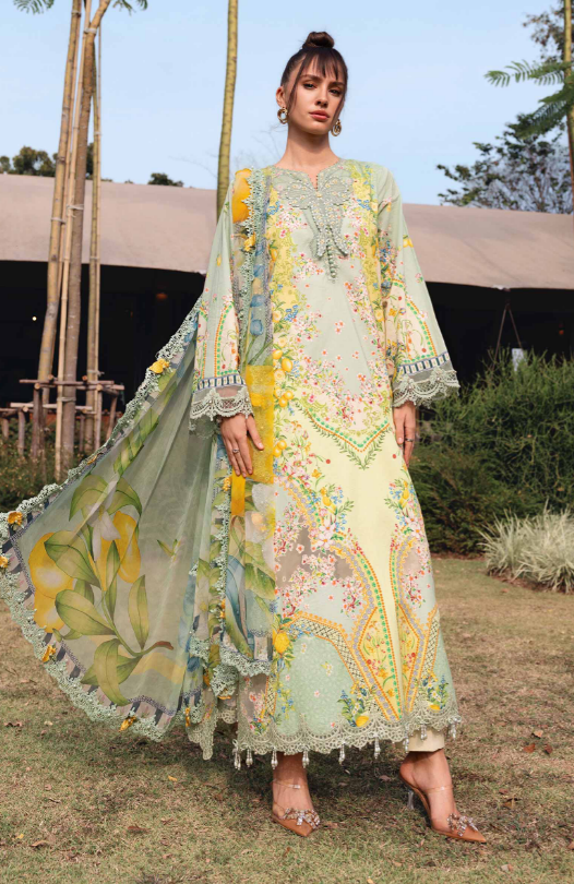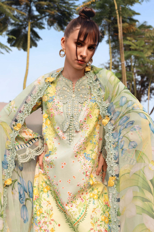 mariab mprints lawn design 8B PRICE 4,300 Description Color: Pistachio GreenShirtPrinted Lawn ShirtEmbroidered Neck Patch & 3D MotifEmbroidered PattiTrouserPrinted Cambric TrouserDupattaPrinted Chiffon DupattaNote: Dry Clean Only Buy Now