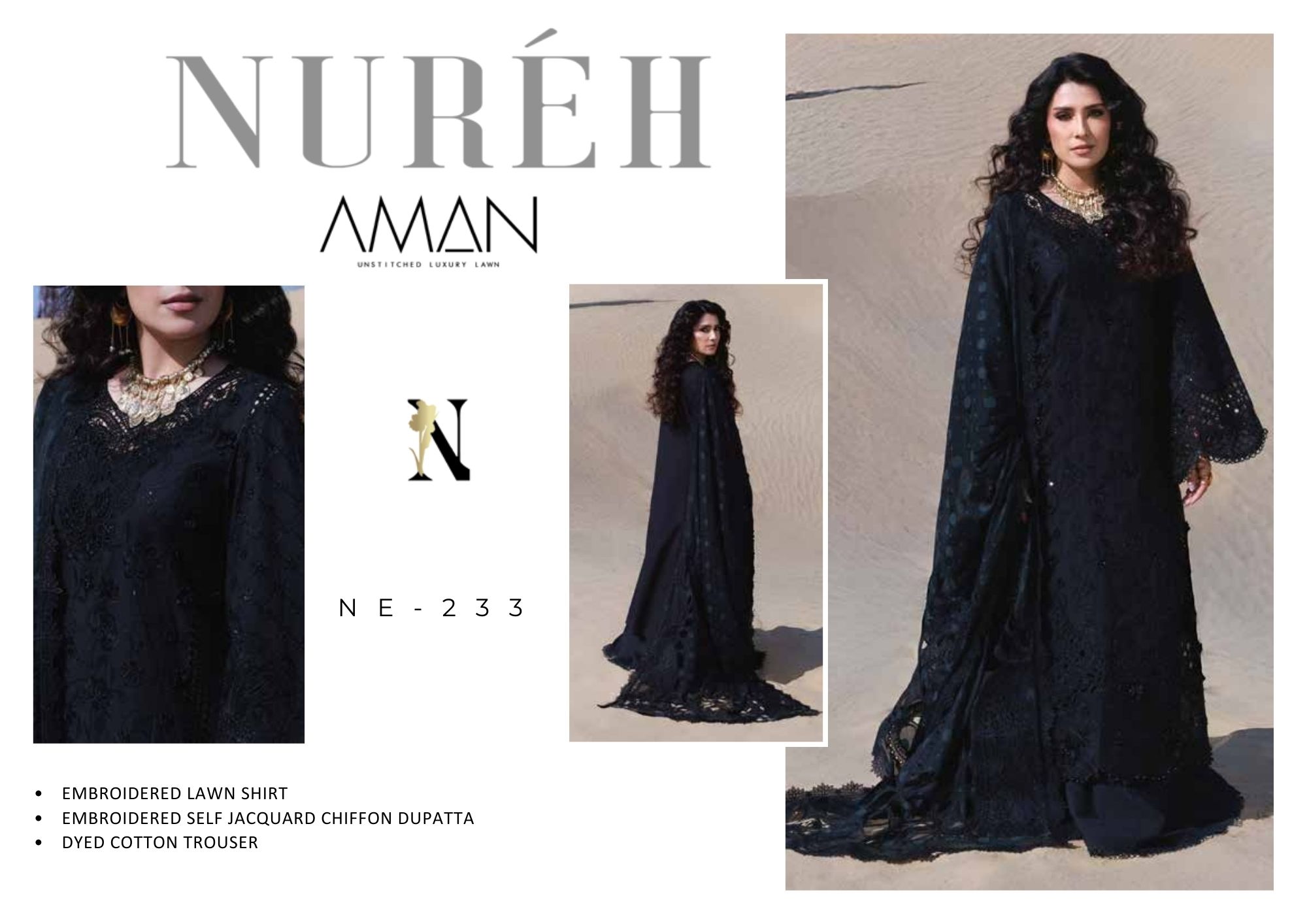 NEW Aman Lawn by Nureh 2026 Zahara NE233 PRICE 4,200 Description EMBROIDERED LAWN SHIRT EMBROIDERED SELF JACQUARD CHIFFON DUPATTA DYED COTTON TROUSER Buy Now