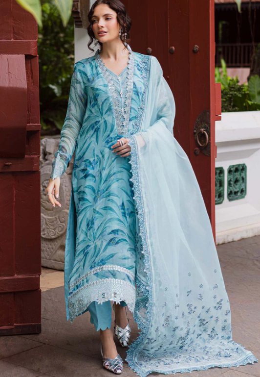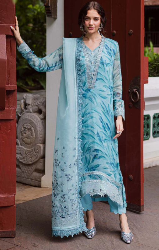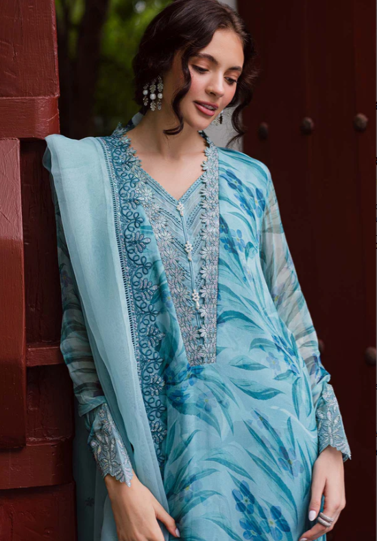 Nureh Ballerina Formals NU2-183 PRICE 3,900 Description Product Description: Printed And Embroidered Chiffon Shirt Embroidered Organza Dupatta Dyed Rawsilk Trouser And Inner Buy Now