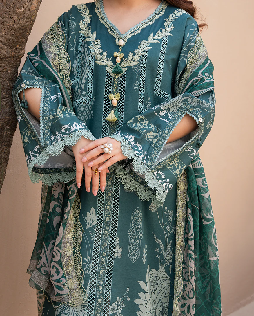 roheenaz summer in bloom design GARDENIA VEIL PRICE 2,600 Shirt • Printed lawn front• Printed lawn back & sleeves• Embroidered neckline (organza) Trouser • Printed trouser Dupatta • Embroidered printed chiffon dupatta Buy Now