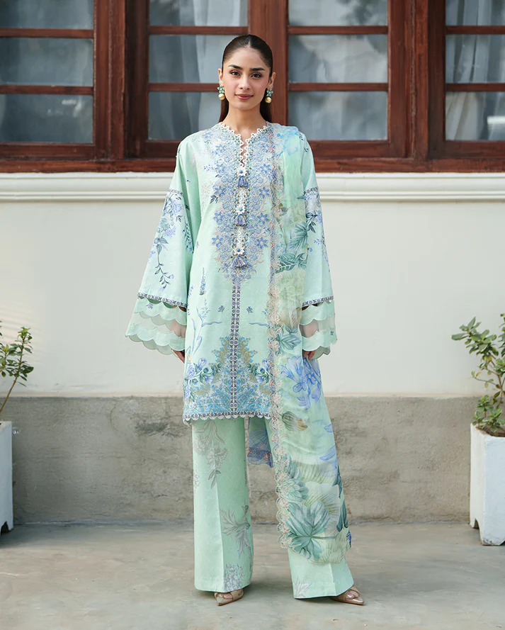 ROHEENAZ WHISPERED FLORALS LAWN DESIGN SOFT MEADOW PRICE 2,600 Shirt • Printed lawn front• Printed lawn back & sleeves• Embroidered neckline (organza) Dupatta • Embroidered printed chiffon dupatta Trouser • Printed trouserSize: Unstitched Buy Now