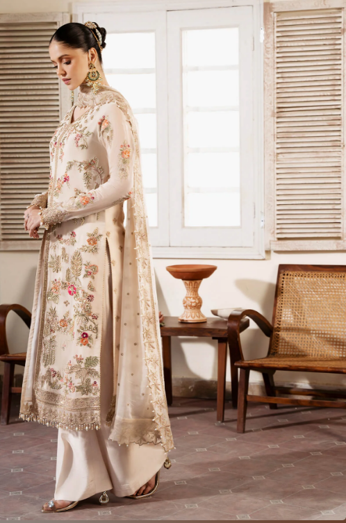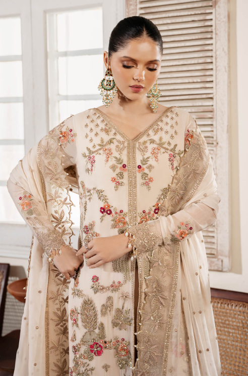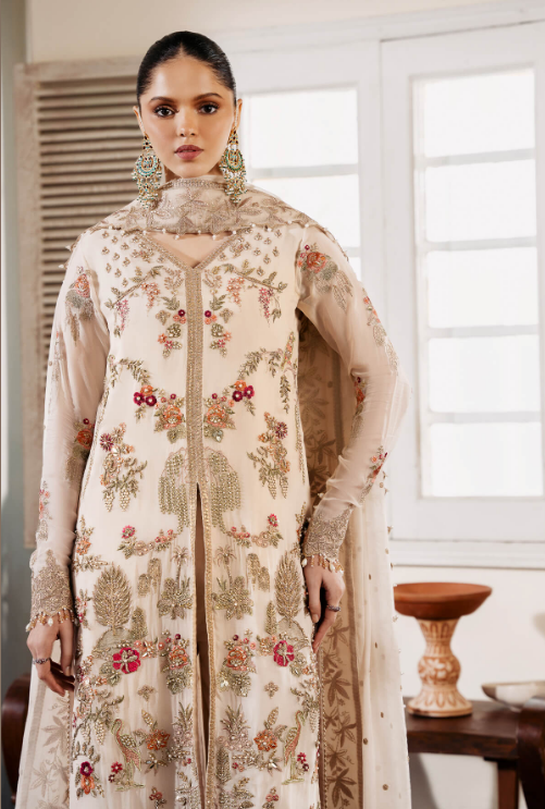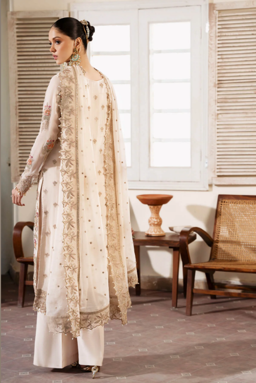 | Fabric: Discover our Muse Luxury Chiffon collection, featuring elegant luxury chiffon dresses with intricate details, perfect for any occasion. Elevate your style today! Embroidered & Hand Embellished chiffon front Embroidered organza front open border Embroidered chiffon back Embroidered organza front back border Embroidered chiffon sleeves Embroidered organza sleeves border Embroidered chiffon dupatta Dyed Raw-silk trousers |
