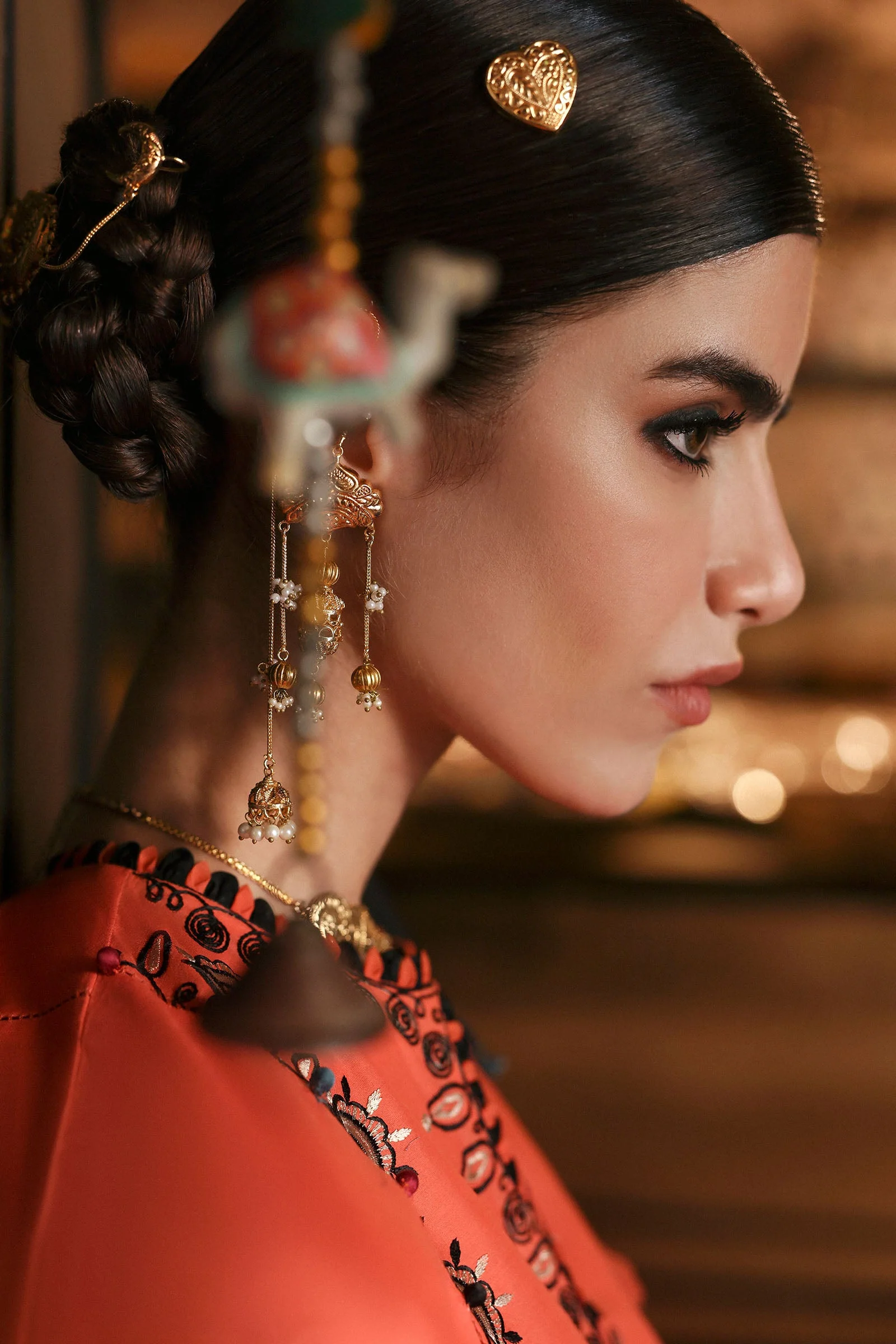 Rangrez is an ode to the vibrant soul of heritage and bold craftsmanship. Crafted on a deep burnt orange canvas, this ensemble features striking boho tribal embroideries in rich black, meticulously placed around the neckline, hemline, and side borders, evoking the intricate artistry of traditional bazaars. Oversized floral tribal motifs bloom on the shirt’s sides, accompanied by an embroidered bird in shades of raspberry, ivory, salmon, and muted blue — a subtle celebration of nature’s quiet beauty.The ensemble is paired with a dramatic black dupatta, adorned with a commanding tribal floral motif, perfectly contrasting yet harmonizing with the warmth of the shirt. Tonal pants complete the look, grounding this statement piece in effortless elegance.Rangrez is designed for the Zaha woman who carries the legacy of her roots with fearless poise and modern sophistication — a true celebration of festive spirit and timeless style.
