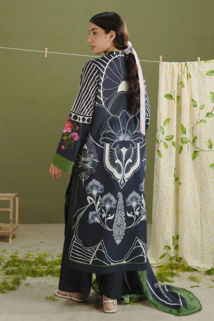 | Fabric: The dupatta is printed in midnight blue with paisley motifs and a moss green border. The shirt features midnight blue and white art nouveau inspired prints. The trouser is finished in solid midnight blue. Digital Printed Silk Dupatta 2.50 Mtrs Digital Printed Lawn Shirt 3.30 Mtrs Digital Printed Cambric Trouser 2 Mtrs |