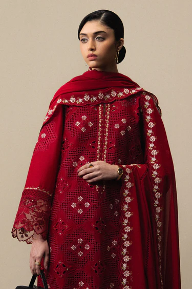 Akari is crafted in striking red with delicate jaali-inspired embroidery, paired with a coordinating embroidered dupatta and finely detailed cambric trousers. Accented with organza borders and embroidered panels, the ensemble exudes heritage-rooted elegance and timeless sophistication.