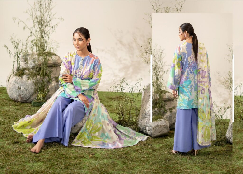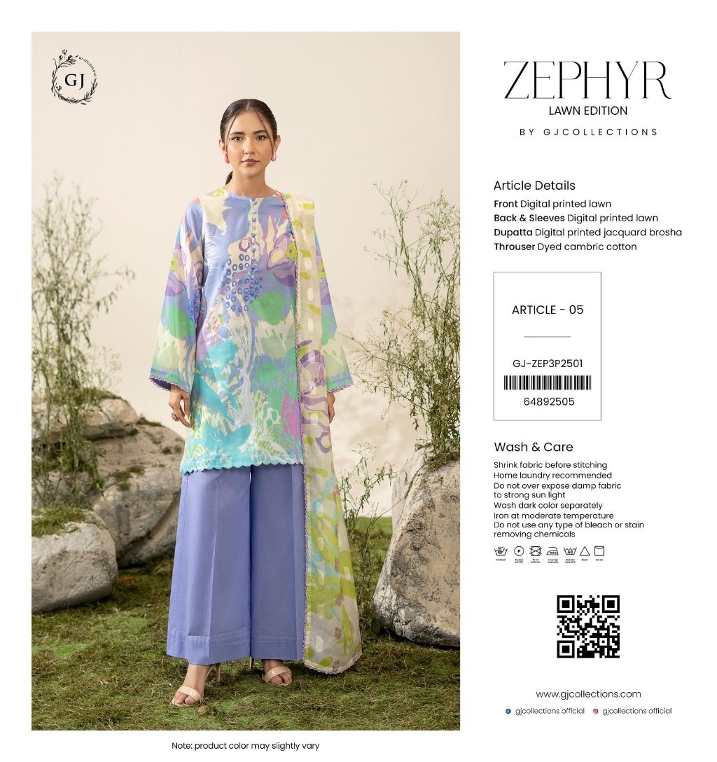 zephyr lawn edition by gulljee article 05 PRICE 1,800 DESCRIPTION: SHIRT DIGITAL PRINTED LAWN DUPATTA DIGITAL PRINTED JAQUARD BROSHA TROUSER DYED CAMBRIC BOTTOM Buy Now