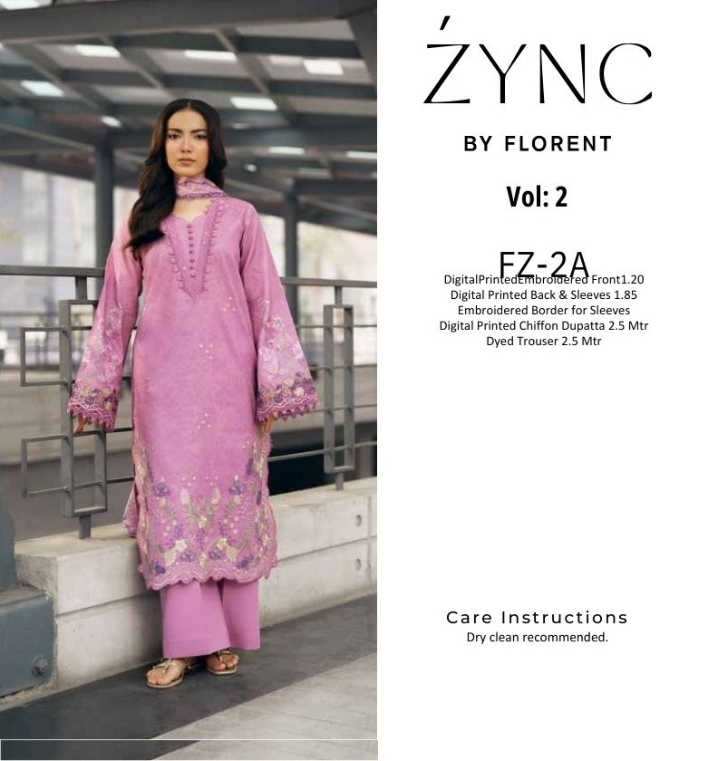 Zync by Florent Summer Collection FL26UZ FZ2A PRICE 2,800 DESCRIPTION Digital Printed Embroidered Front 1.20 Digital Printed Back & Sleeves 1.85 Embroidered Border for Sleeves Digital Printed Chiffon Dupatta 2.5 Mtr Dyed Trouser 2.5 Mtr Buy Now
