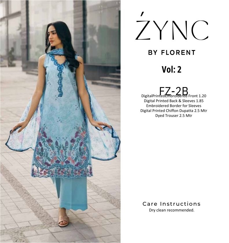Zync by Florent Summer Collection FL26UZ FZ2B PRICE 2,800 DESCRIPTION Digital Printed Embroidered Front 1.20 Digital Printed Back & Sleeves 1.85 Embroidered Border for Sleeves Digital Printed Chiffon Dupatta 2.5 Mtr Dyed Trouser 2.5 Mtr Buy Now