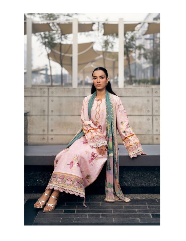 Digital Printed Embroidered Front 1.20 Digital Printed Back & Sleeves 1.85 Mtr Embroidered Border for Sleeves 1 Yard Digital Printed Chiffon Dupatta 2.5 Mtr Dyed Trouser 2.5 Mtr